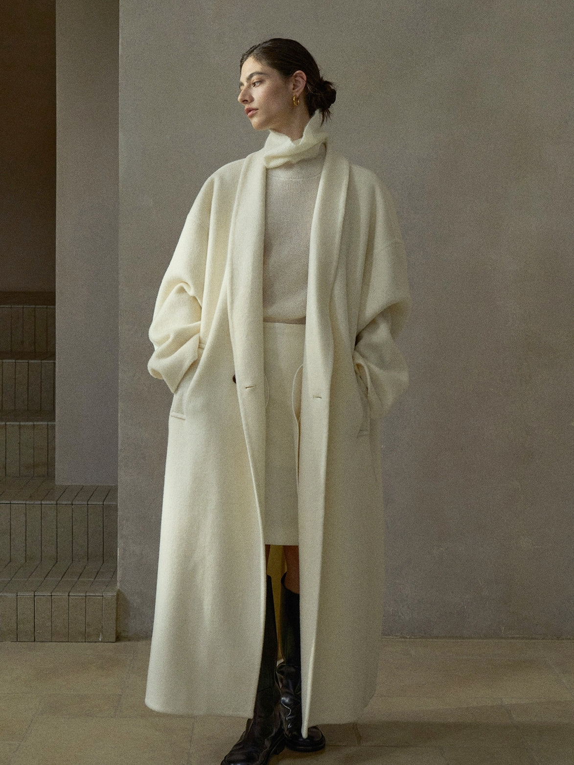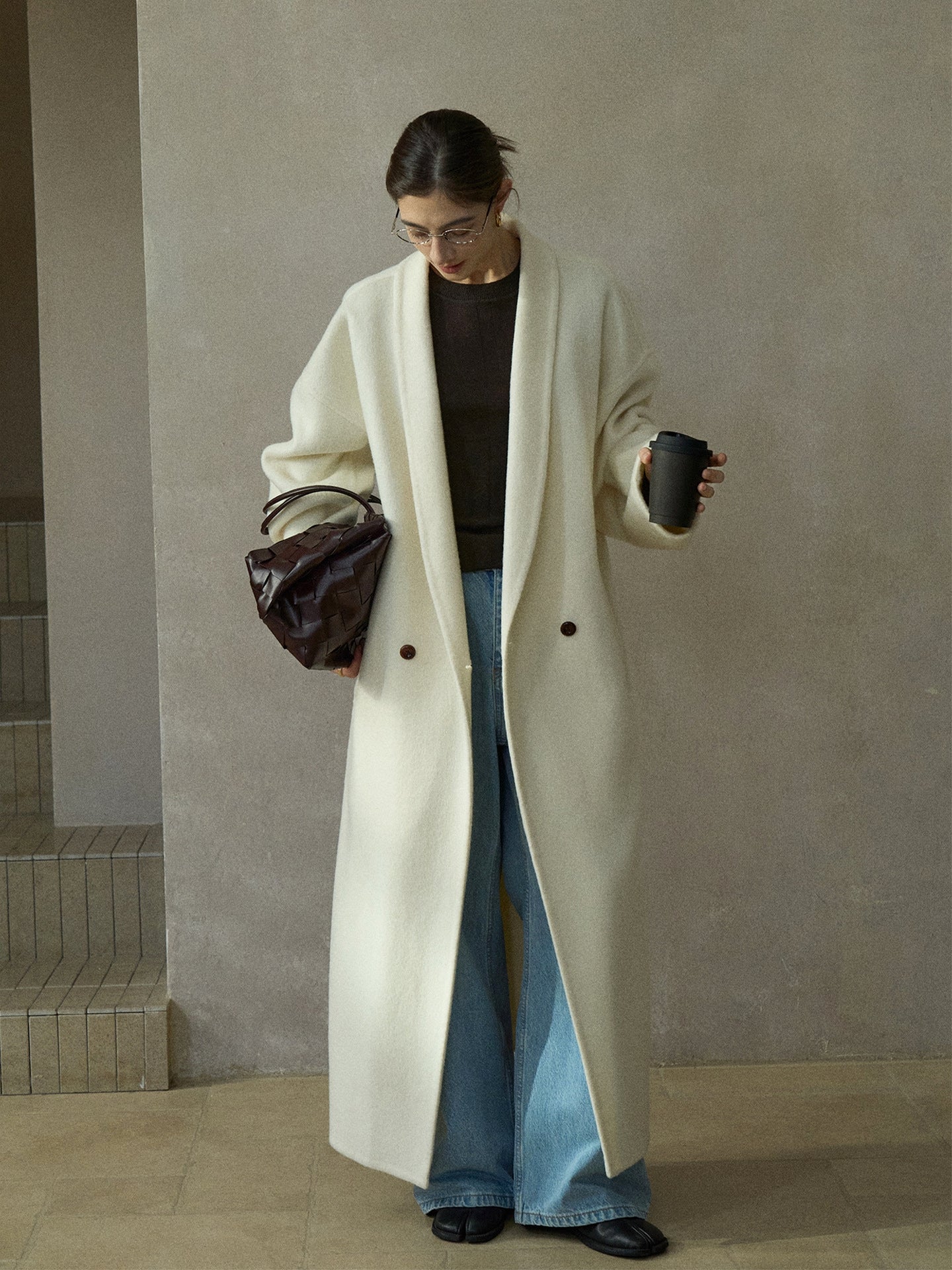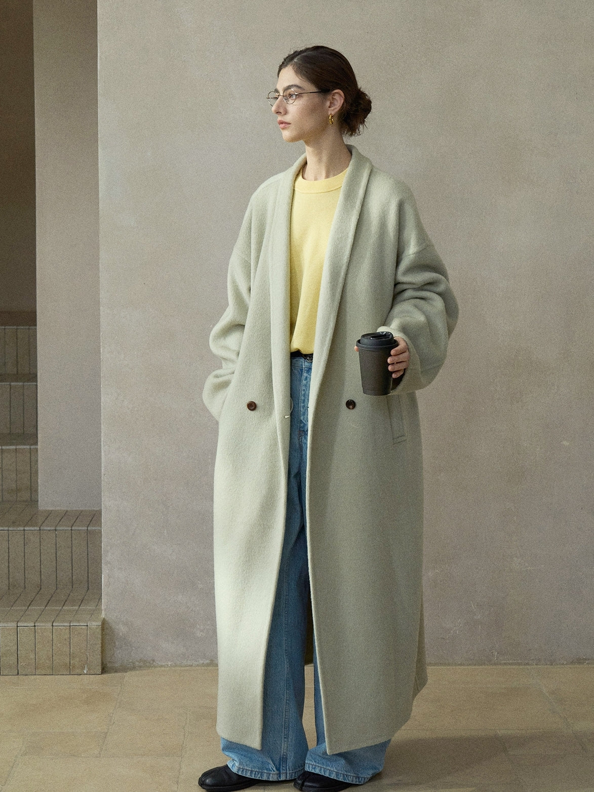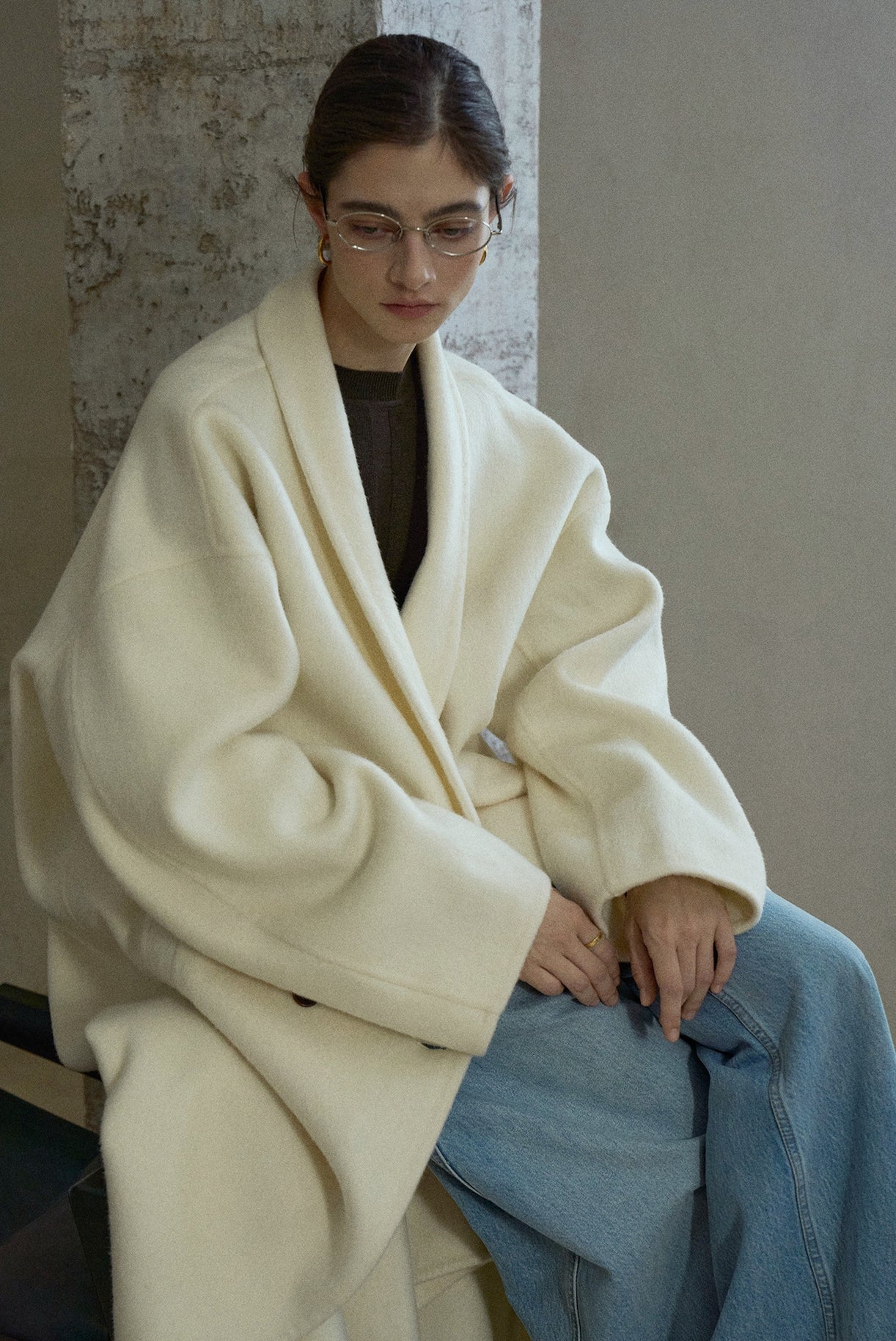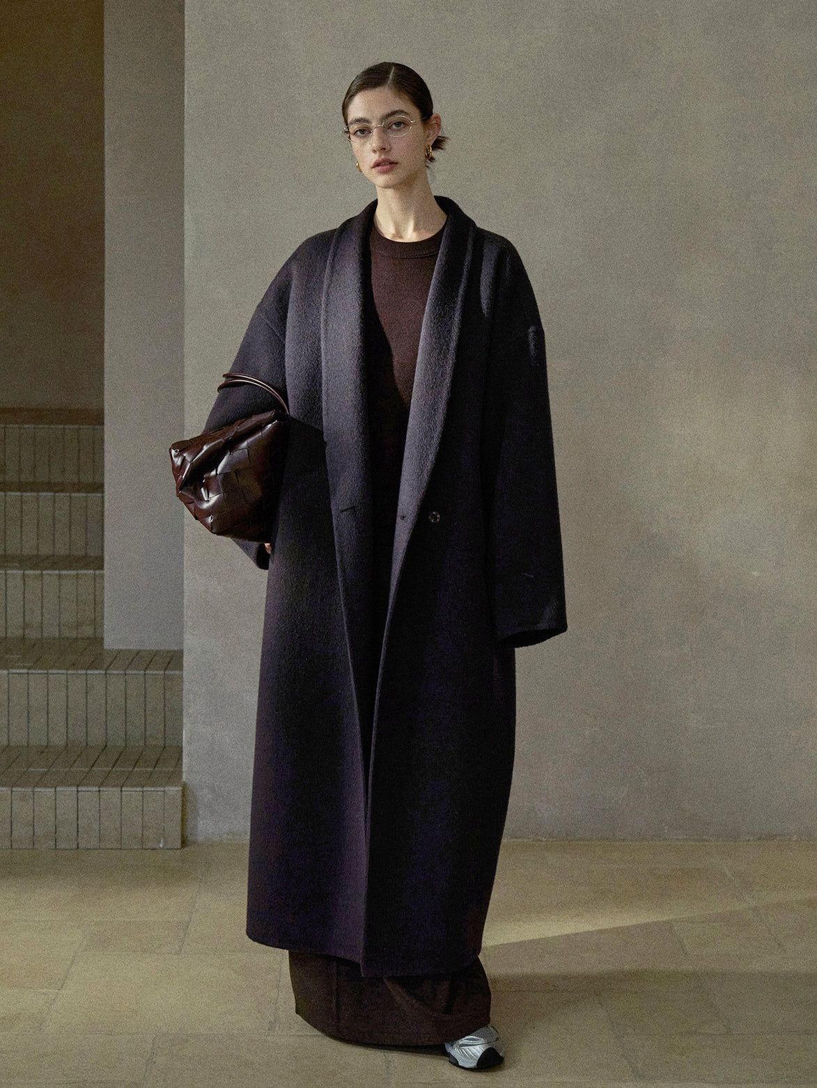 ドロップショルダーの抜け感あるショールカラーロングコート。