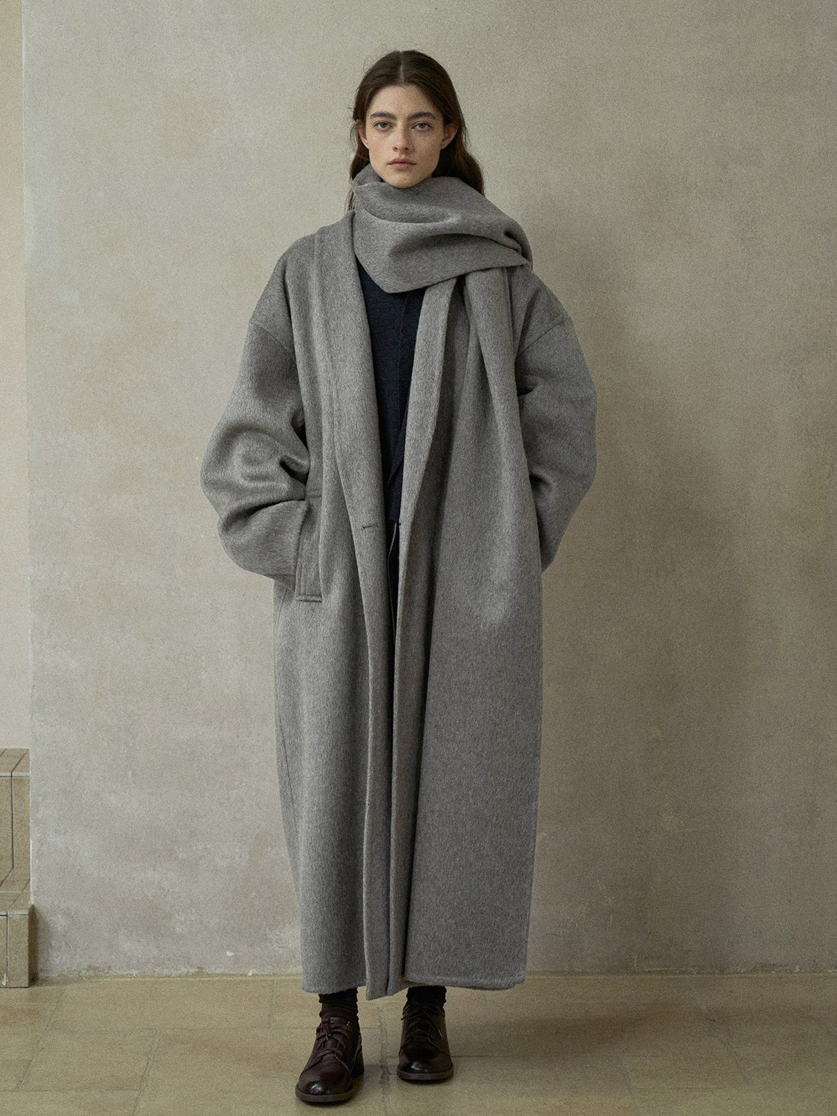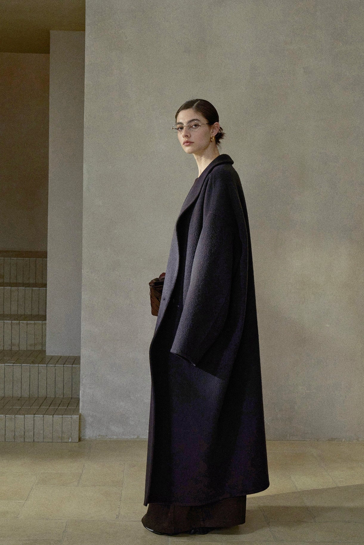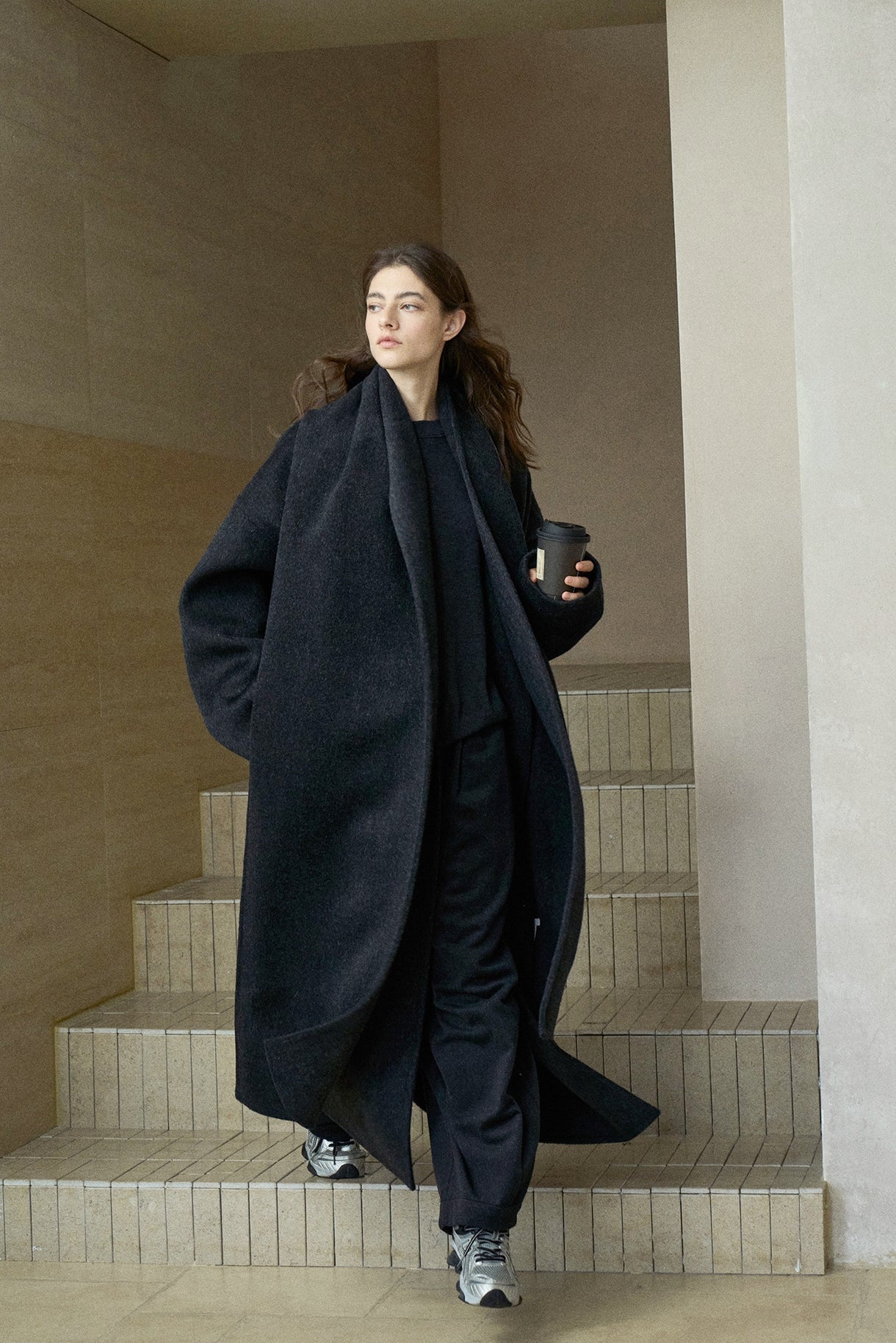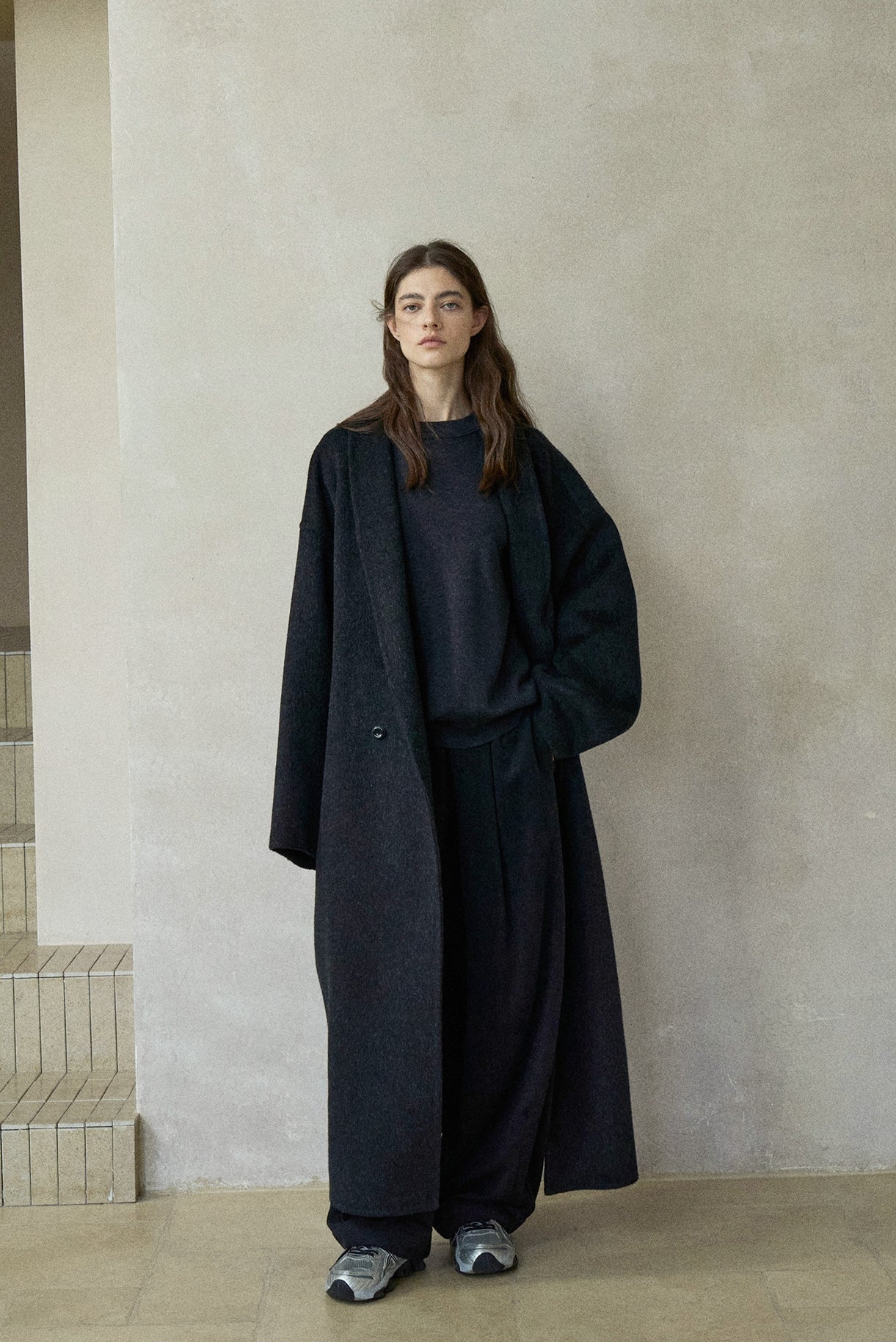 ドロップショルダーの抜け感あるショールカラーロングコート。