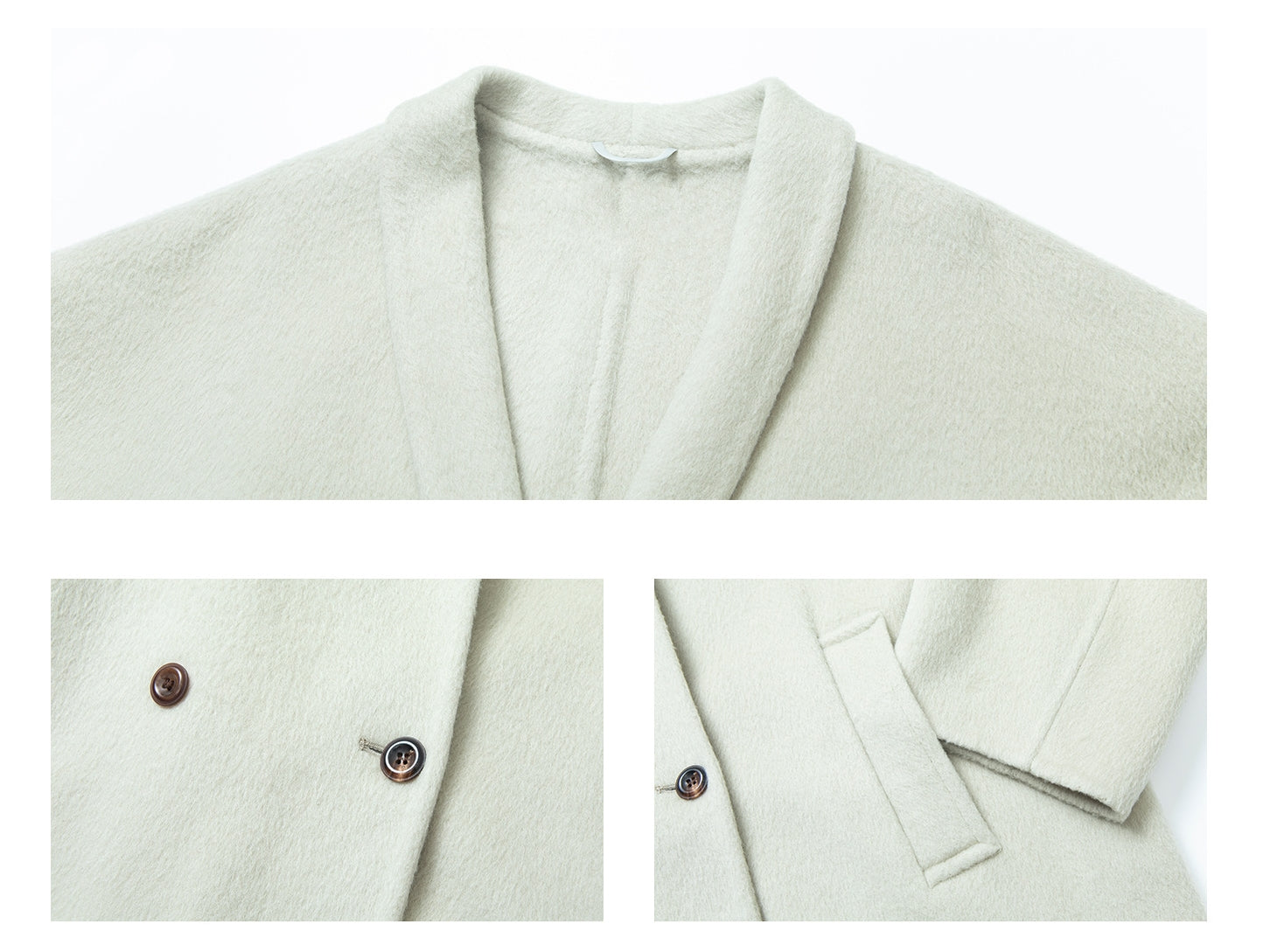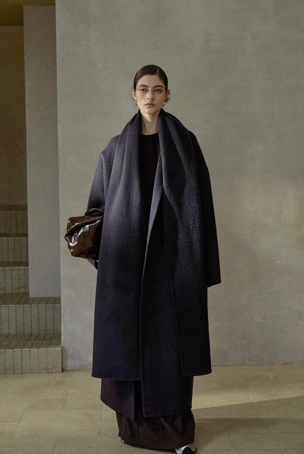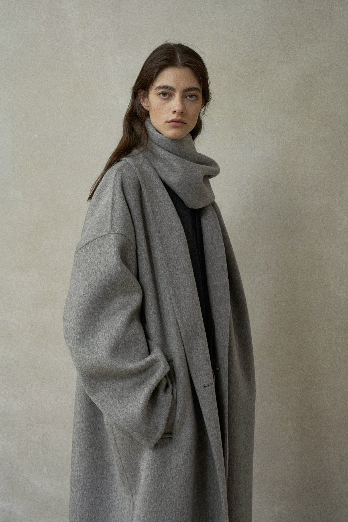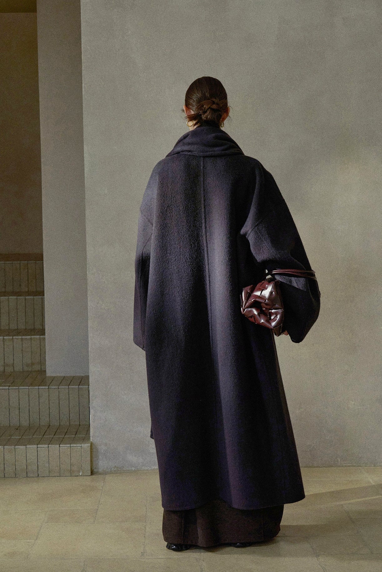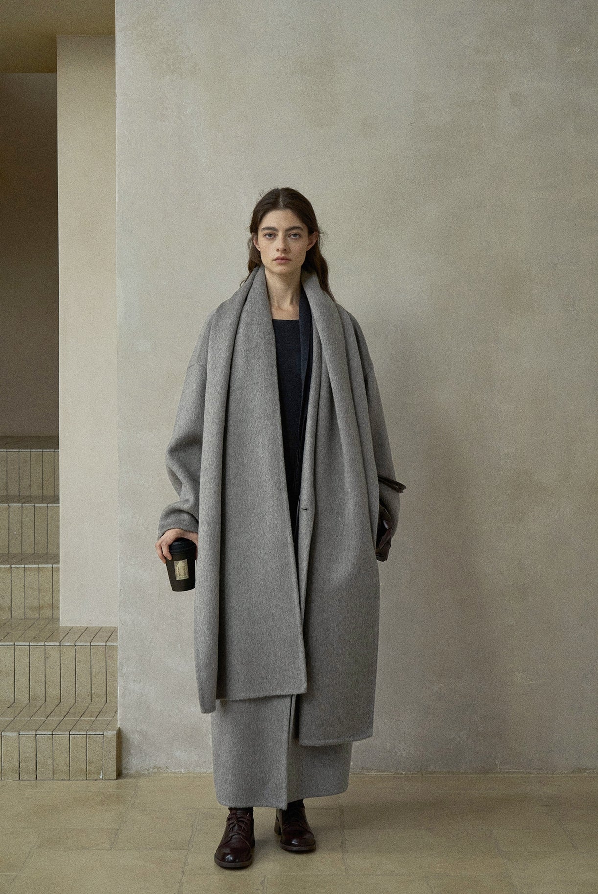 ドロップショルダーの抜け感あるショールカラーロングコート。