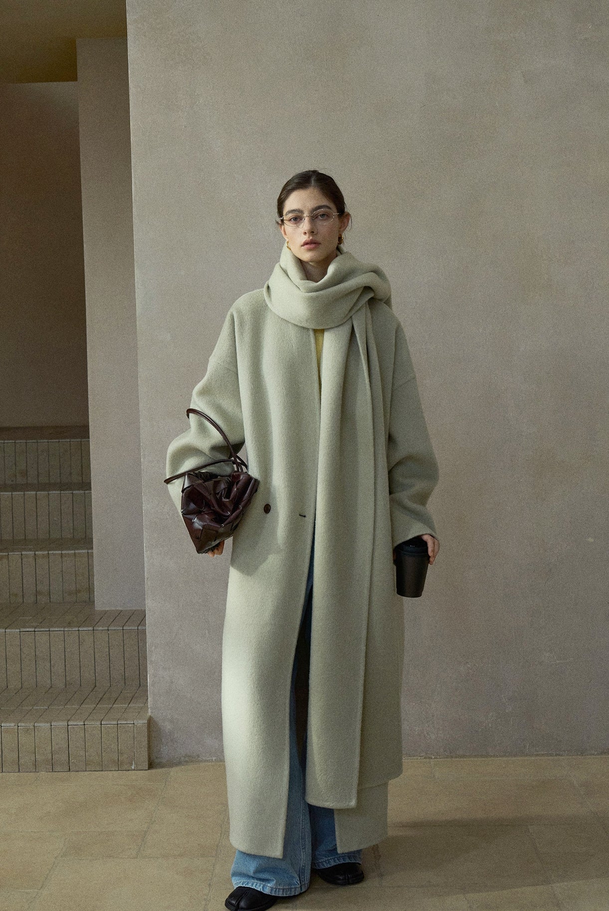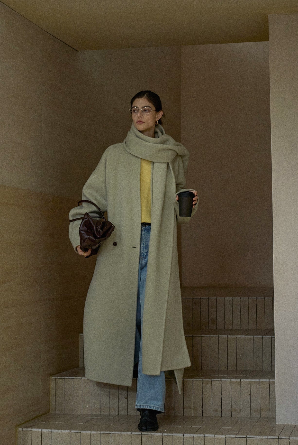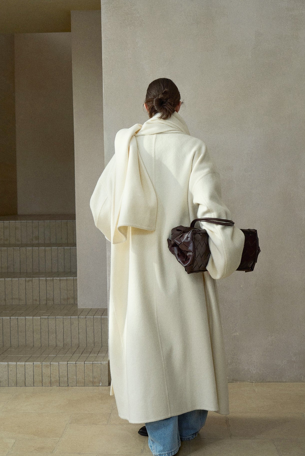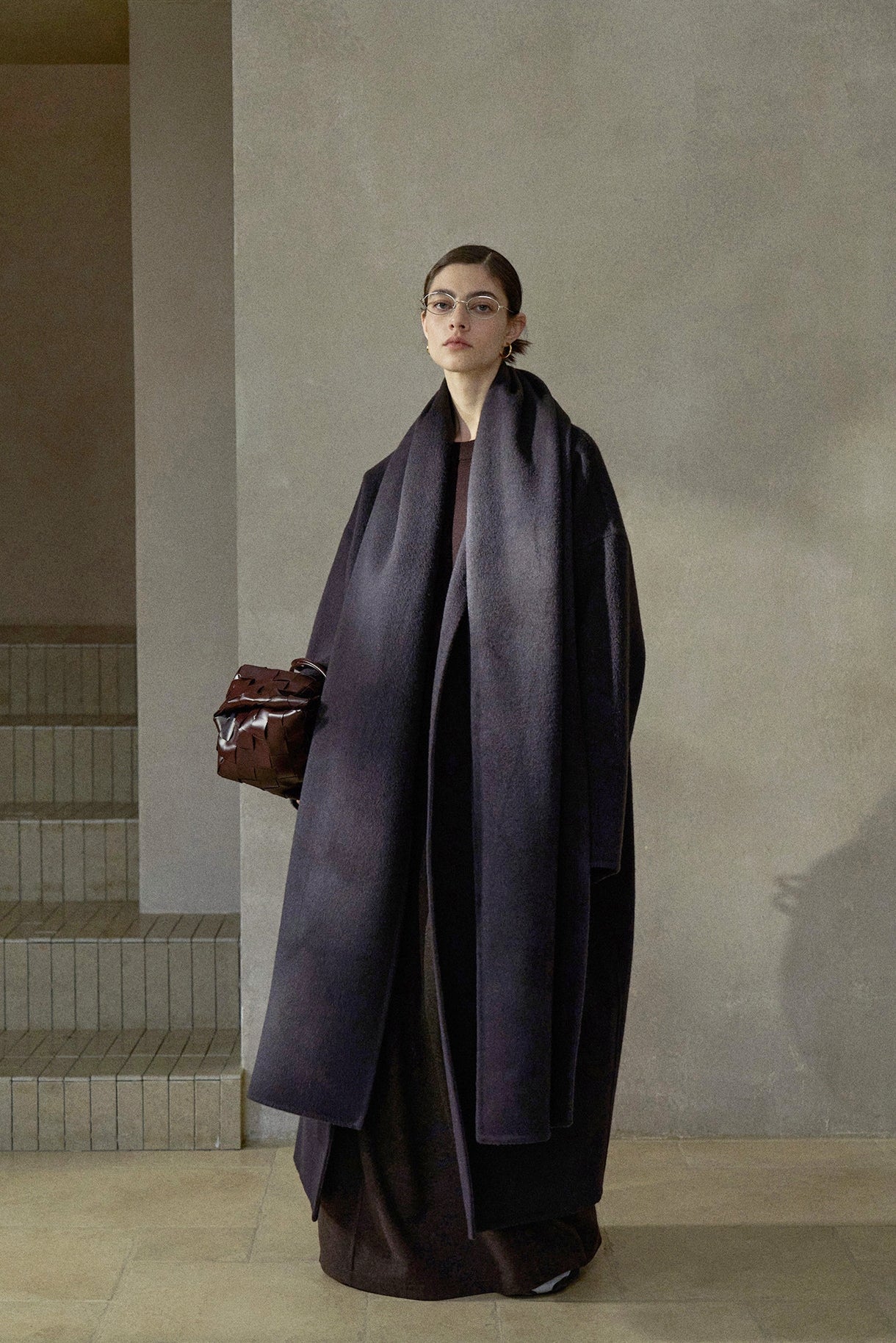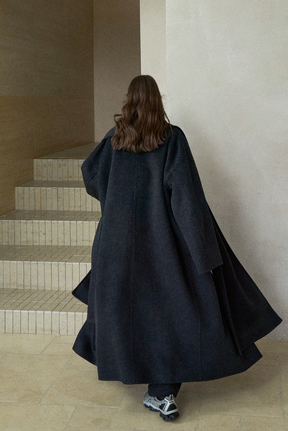 ドロップショルダーの抜け感あるショールカラーロングコート。