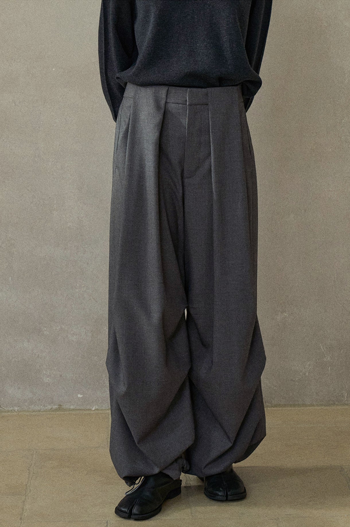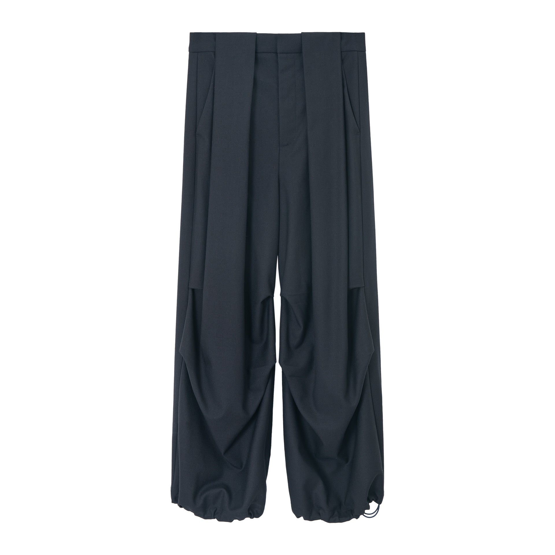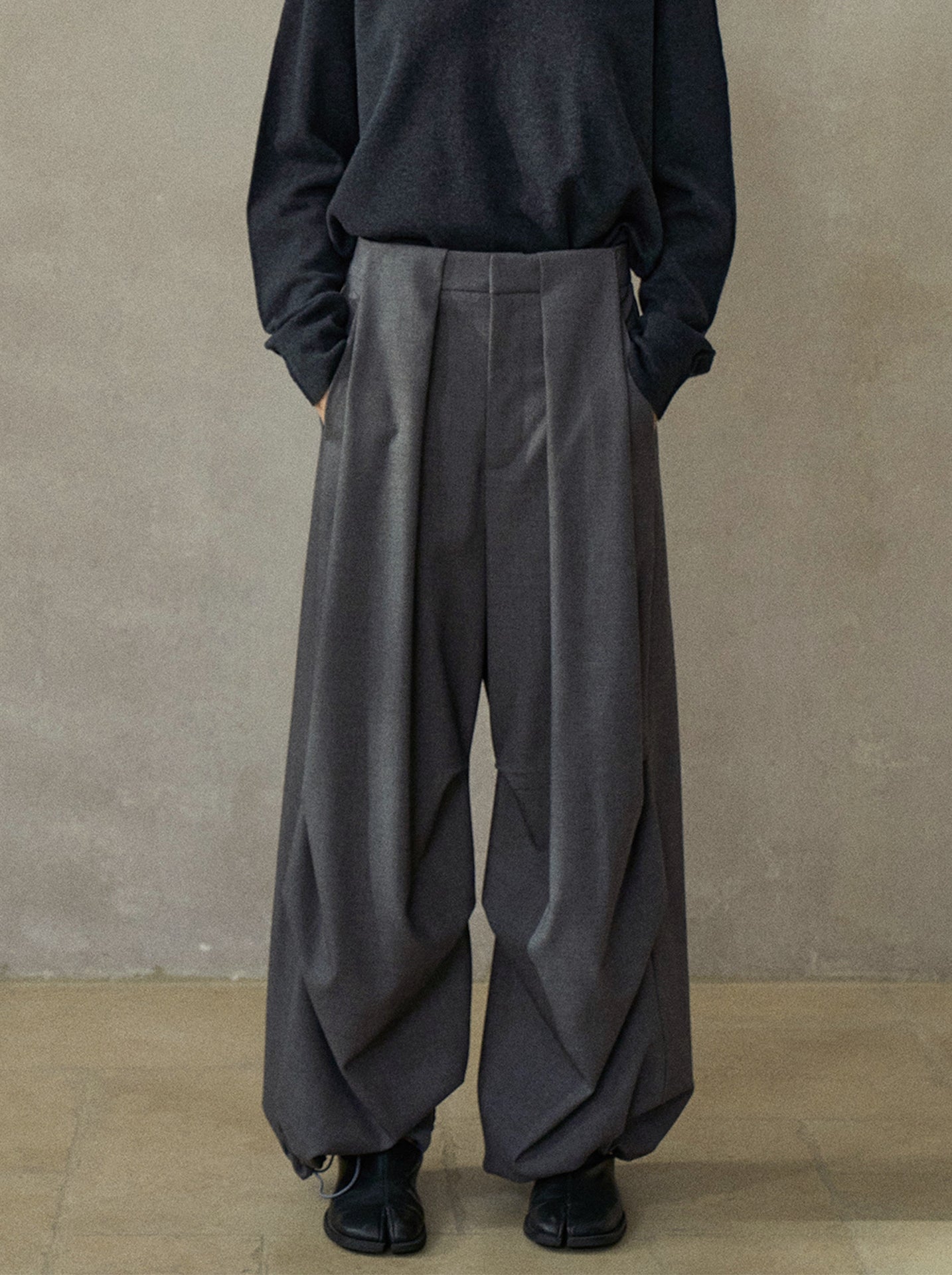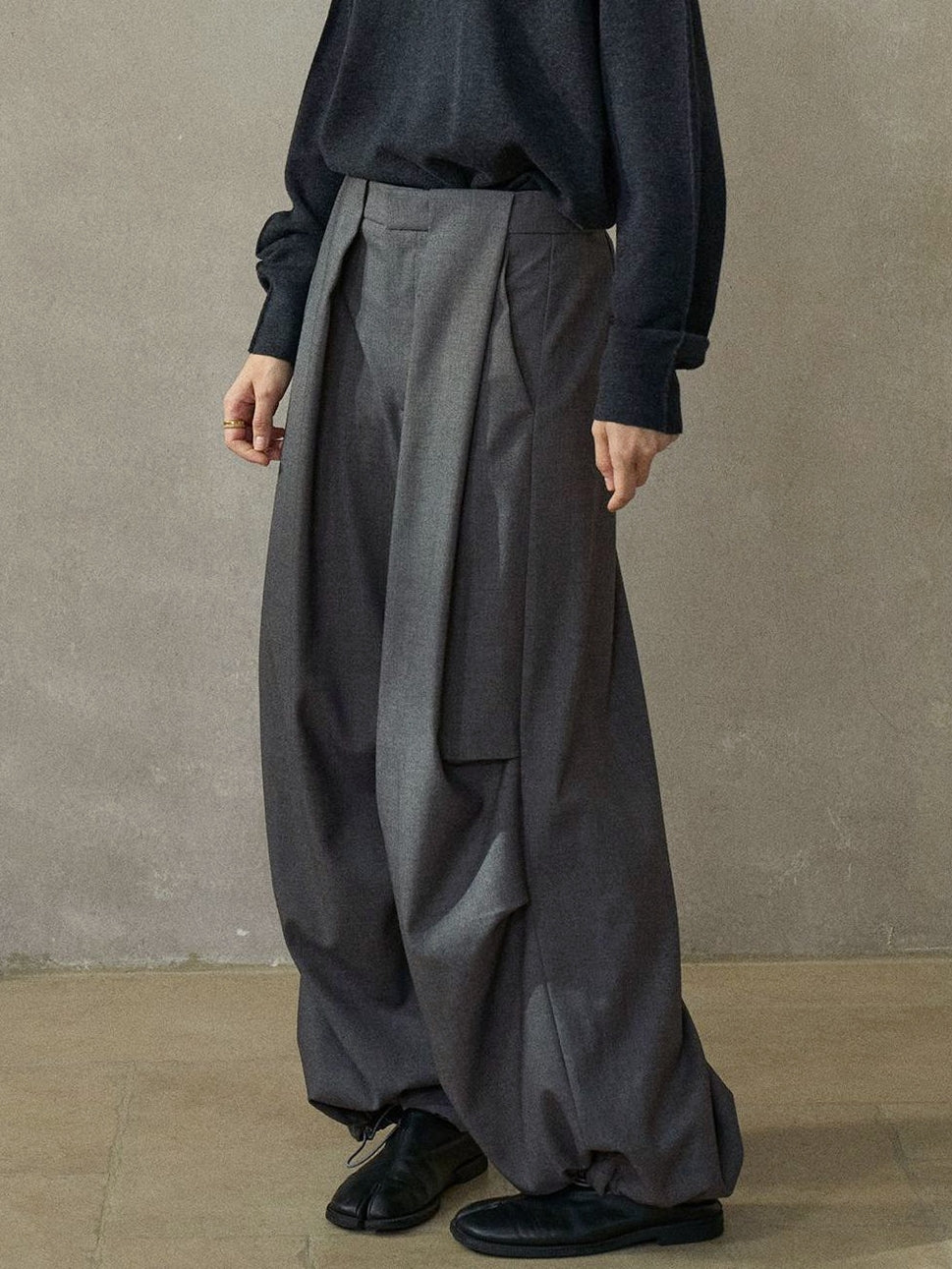 サイドのタックとウエストのワイドなベルトループ、さらにドローストリングを施したパッと目をひくワイドトラウザー。
