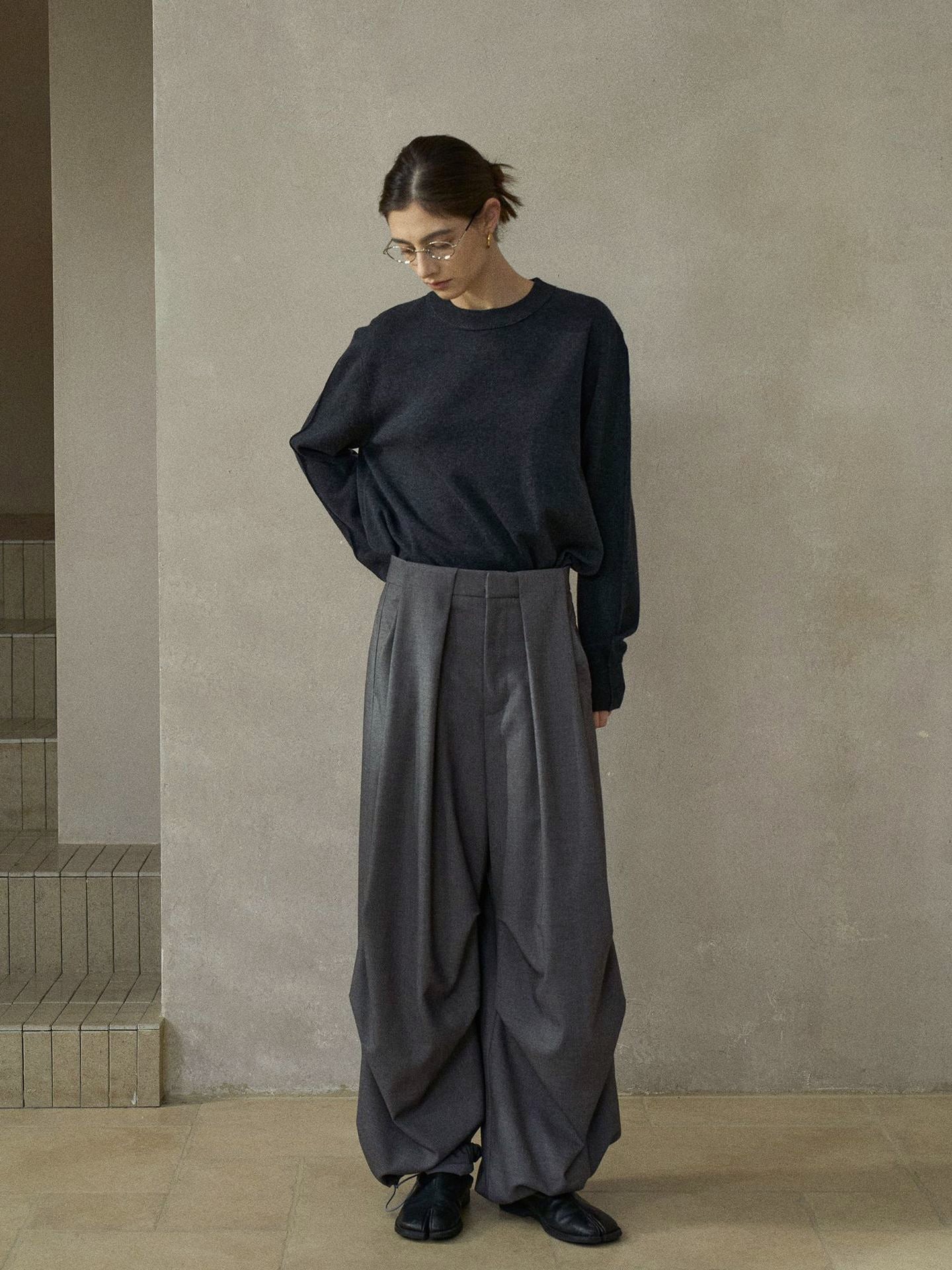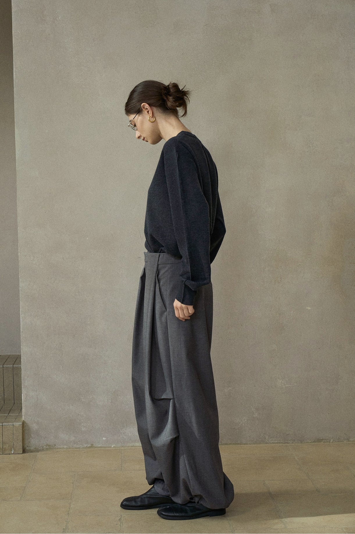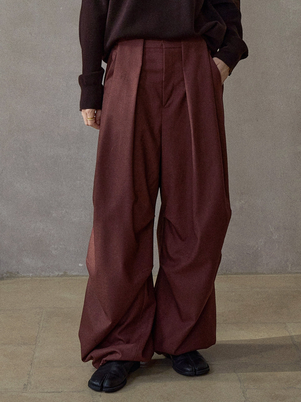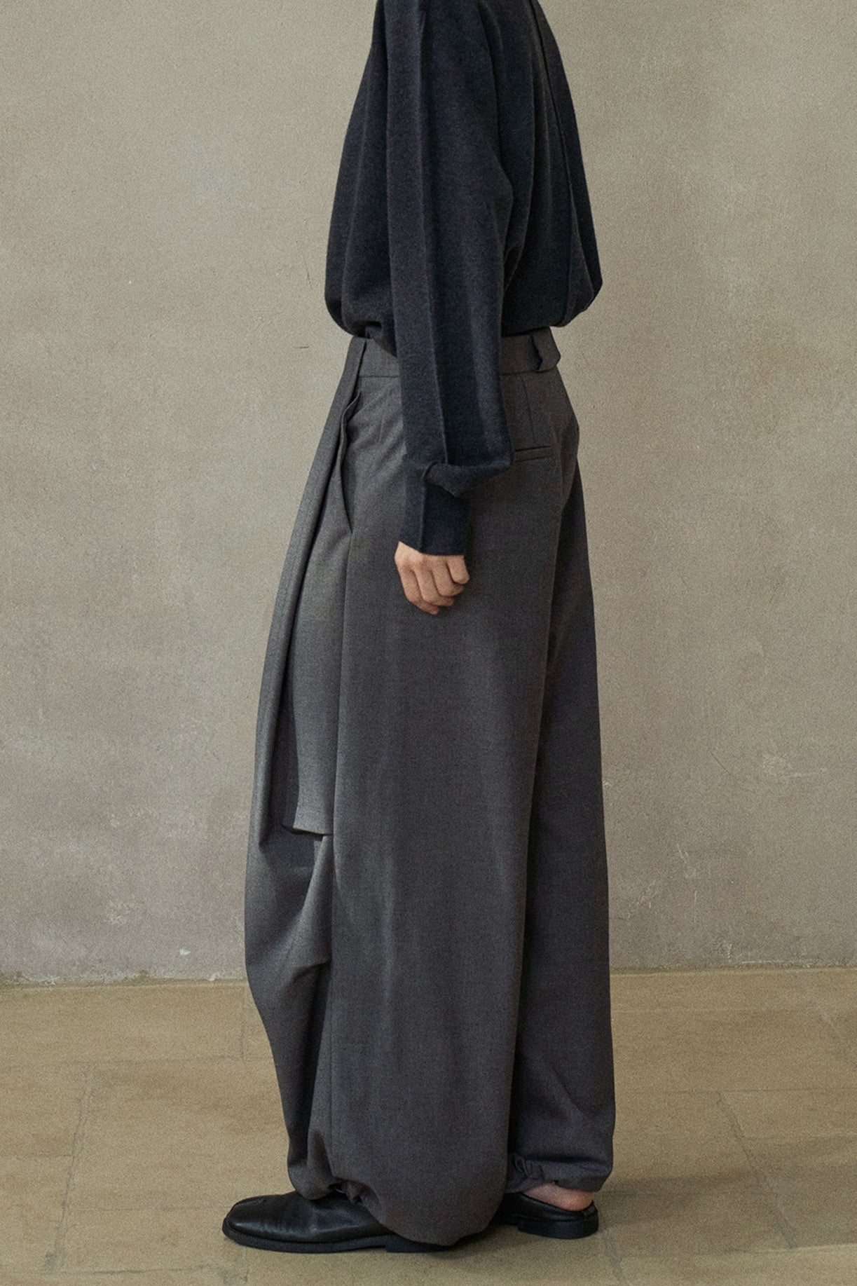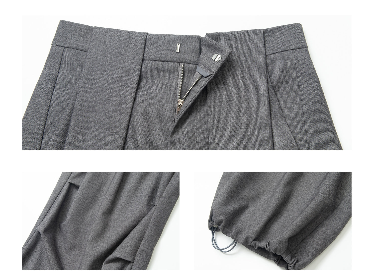 サイドのタックとウエストのワイドなベルトループ、さらにドローストリングを施したパッと目をひくワイドトラウザー。