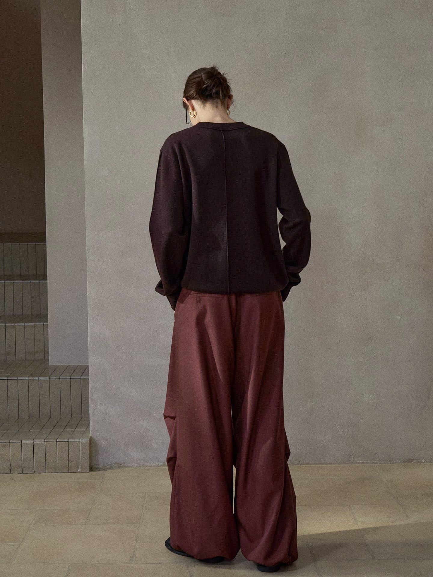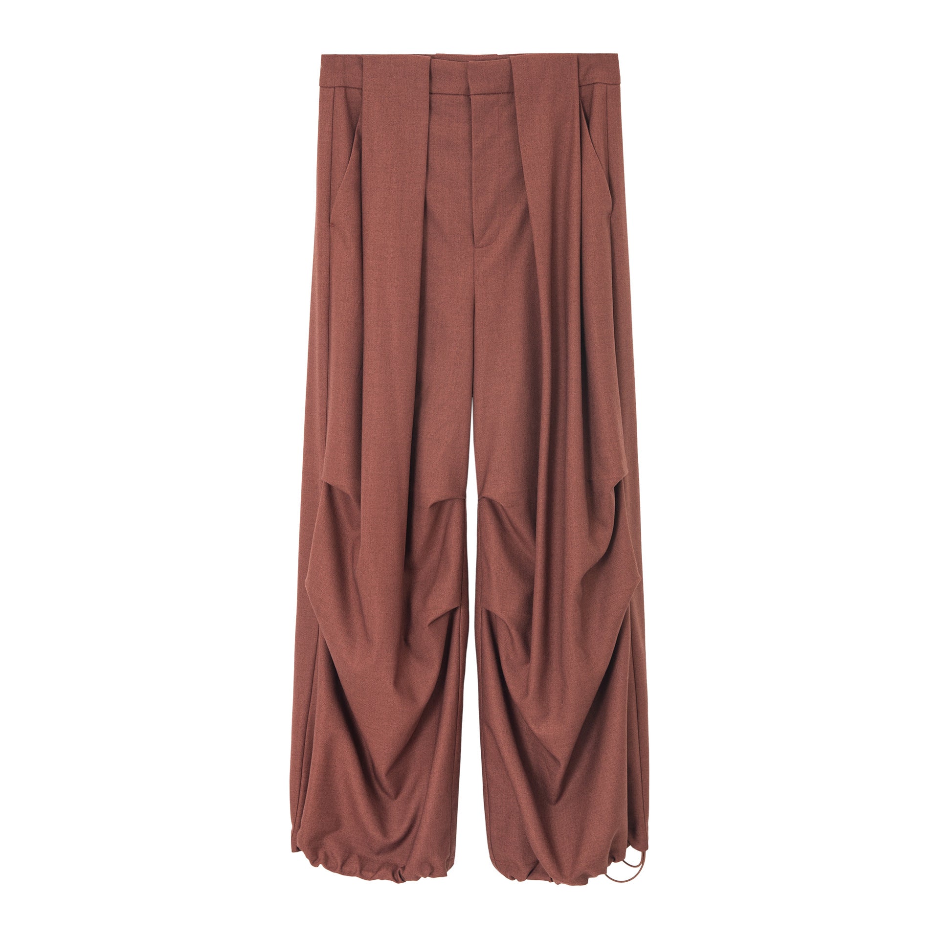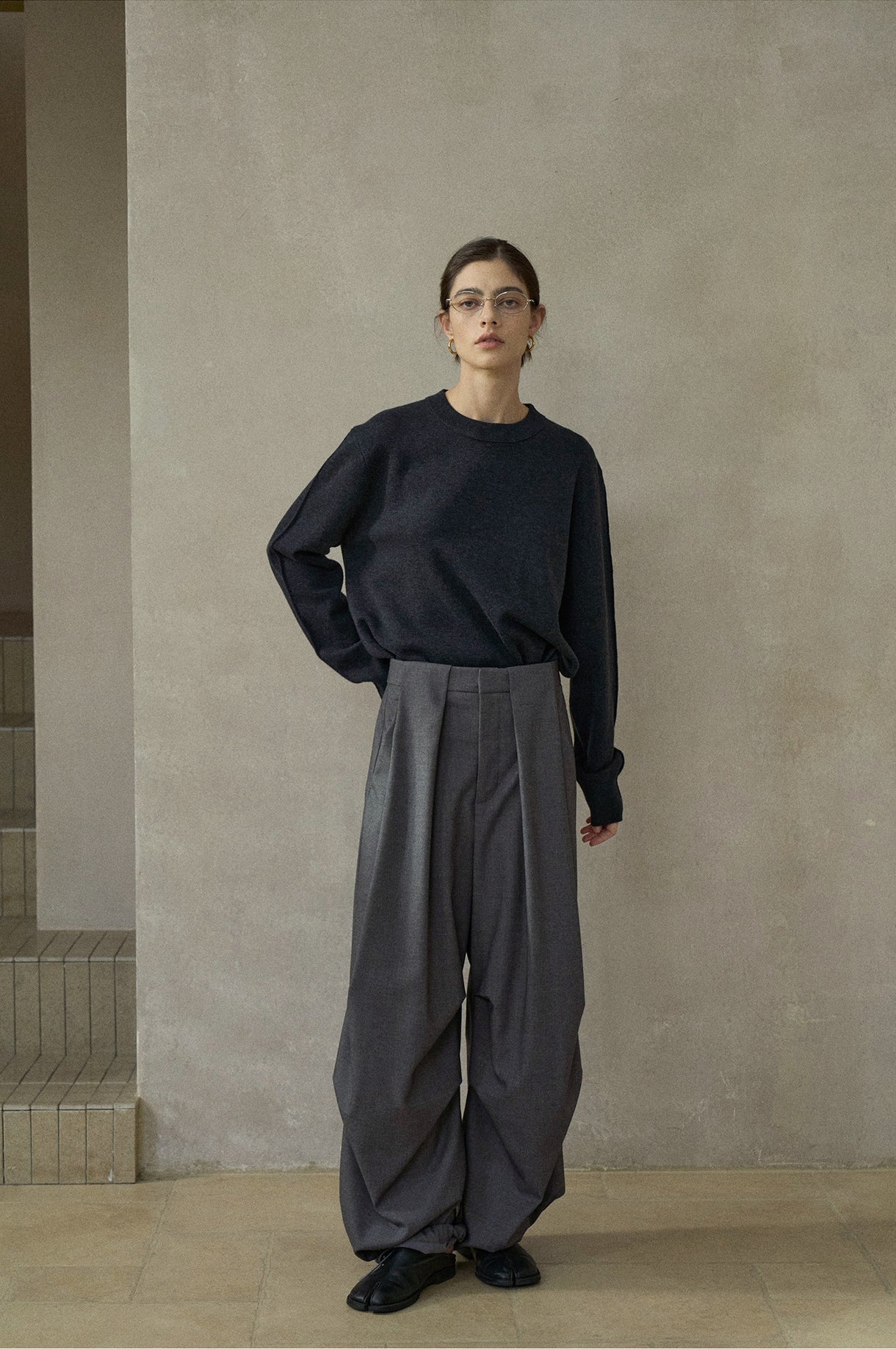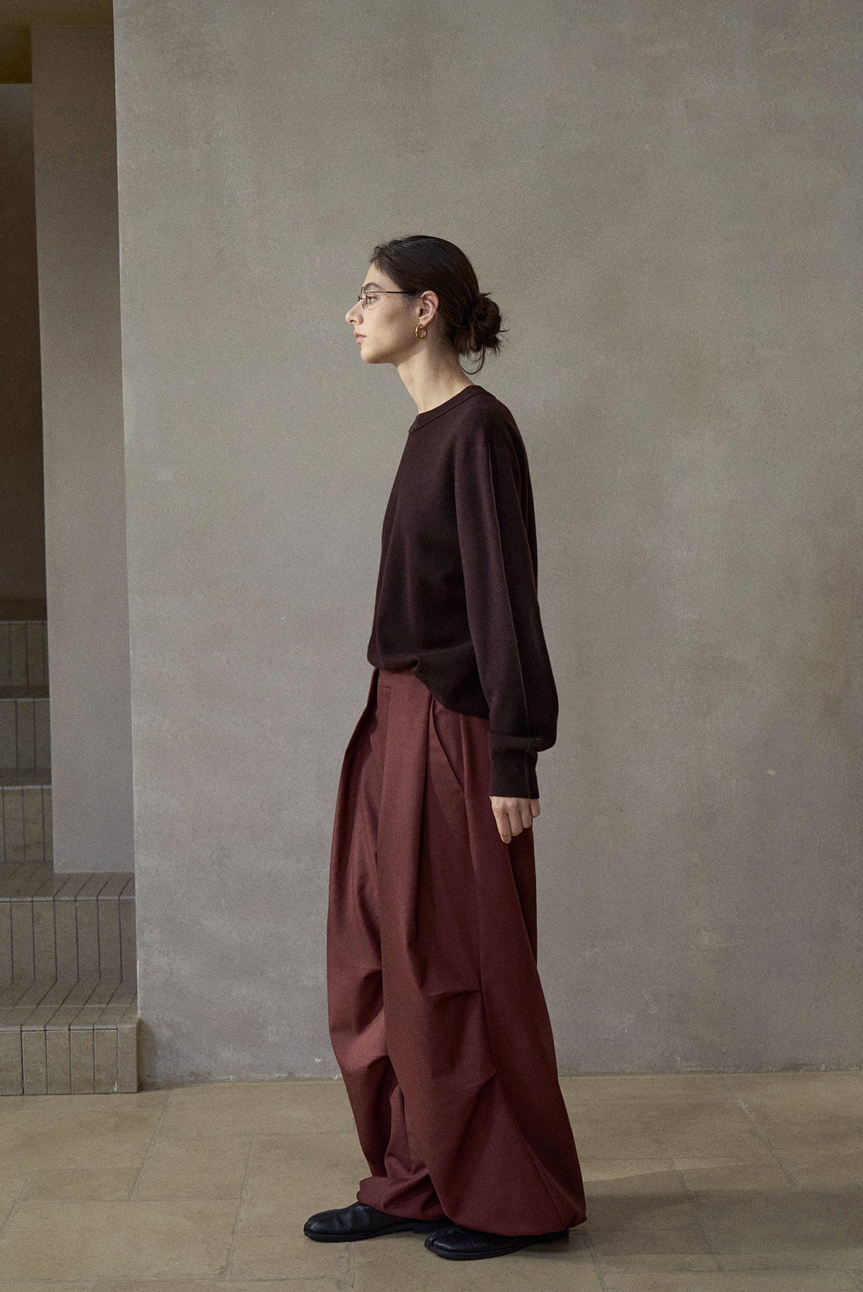 サイドのタックとウエストのワイドなベルトループ、さらにドローストリングを施したパッと目をひくワイドトラウザー。