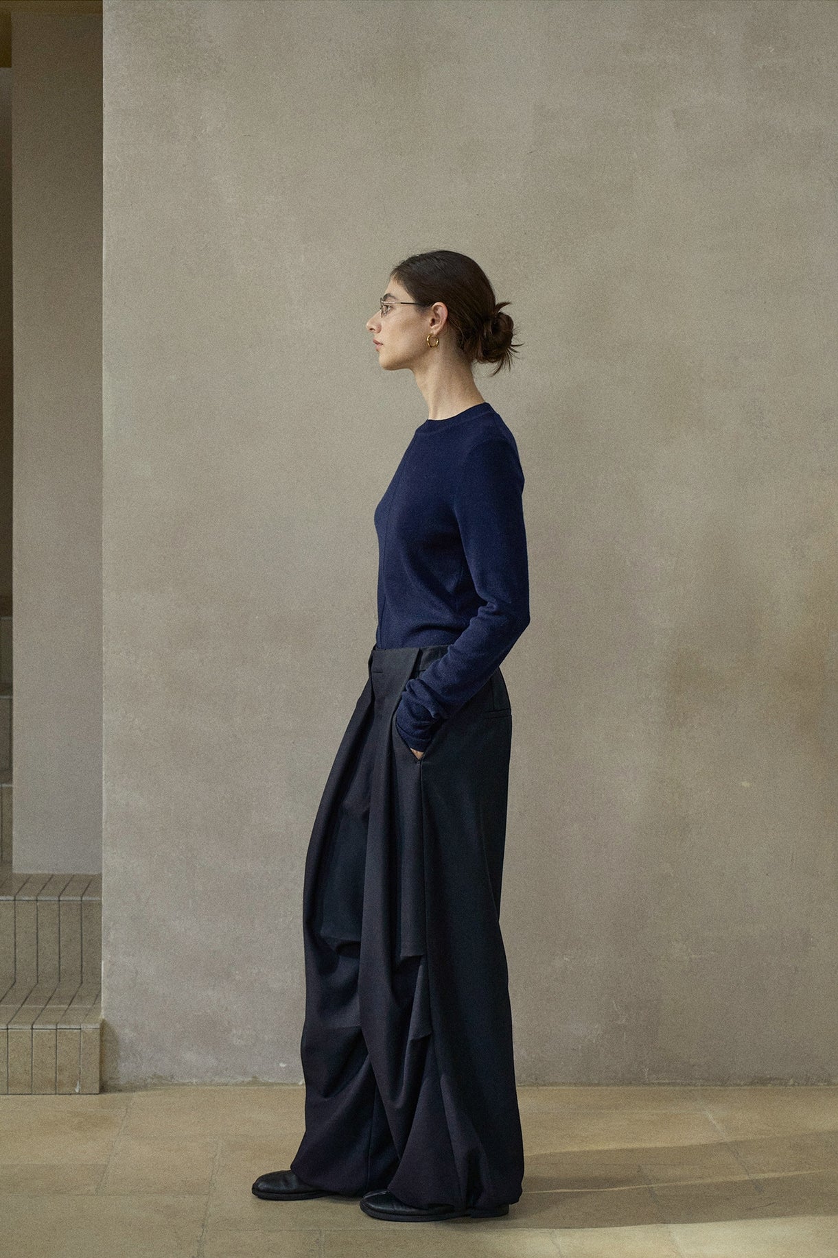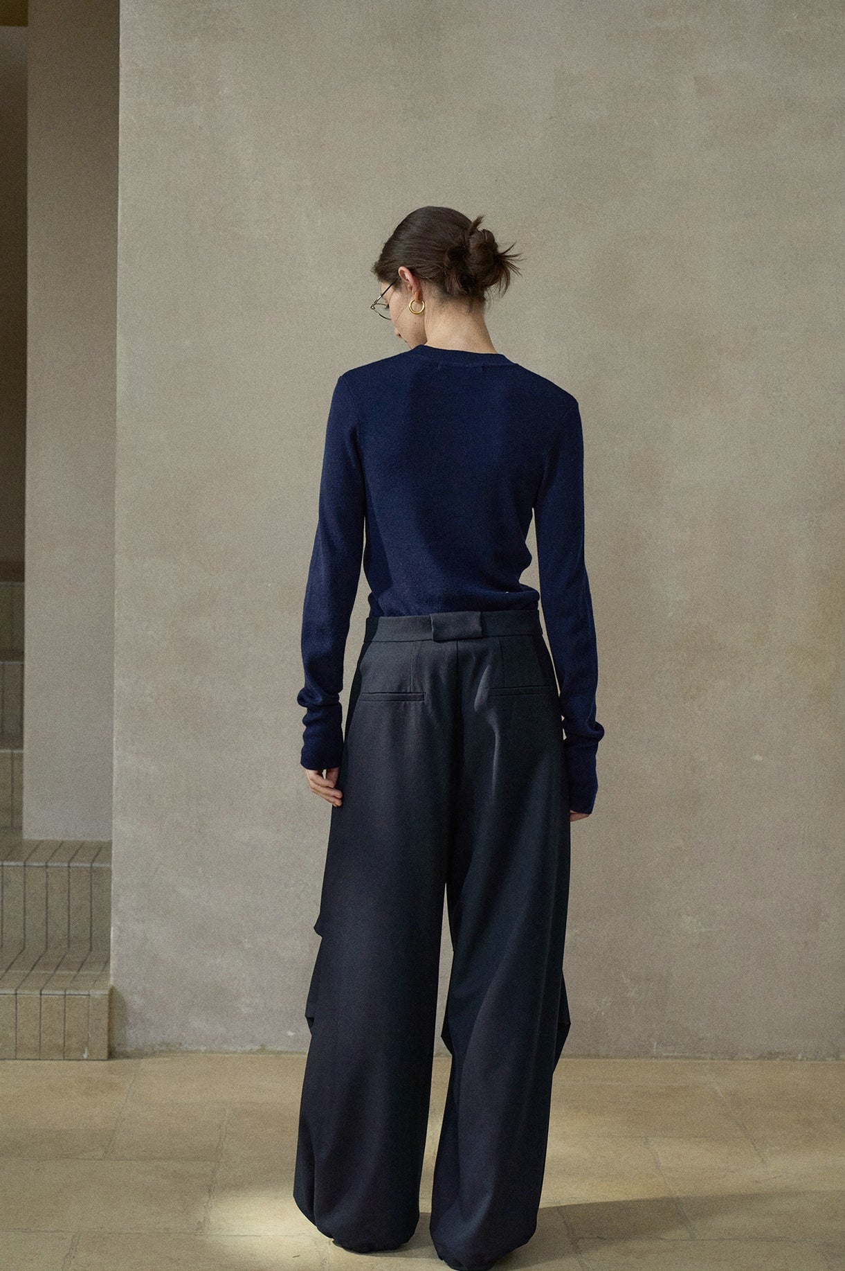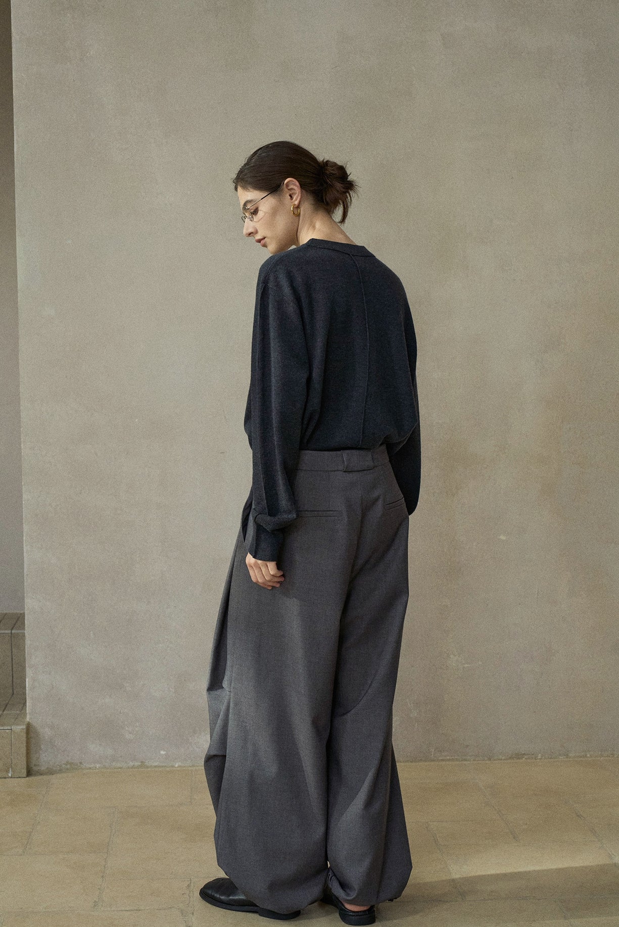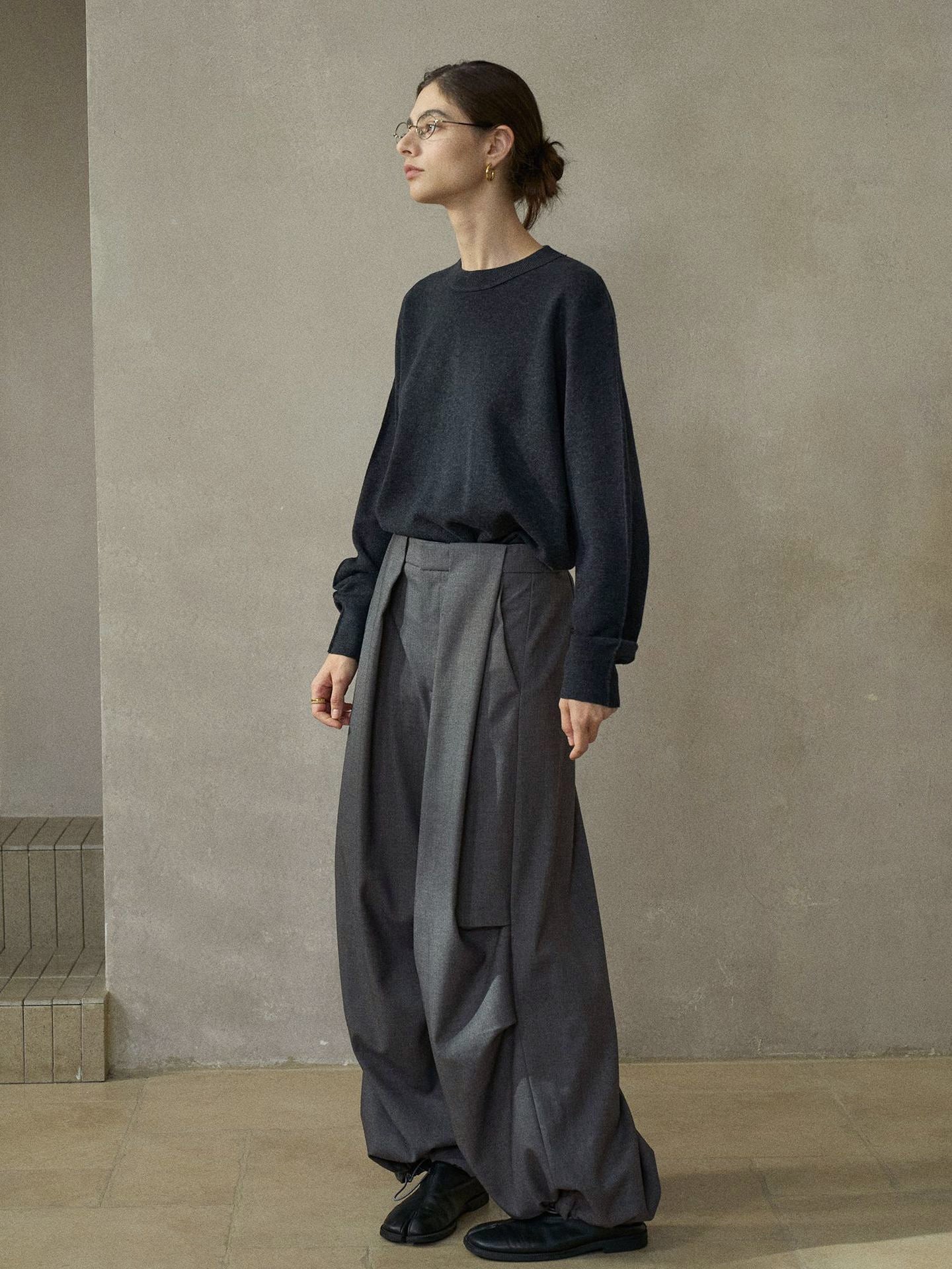 フロントのサイドタックが立体的な陰影を生み、シンプルなトップスでも印象的に。