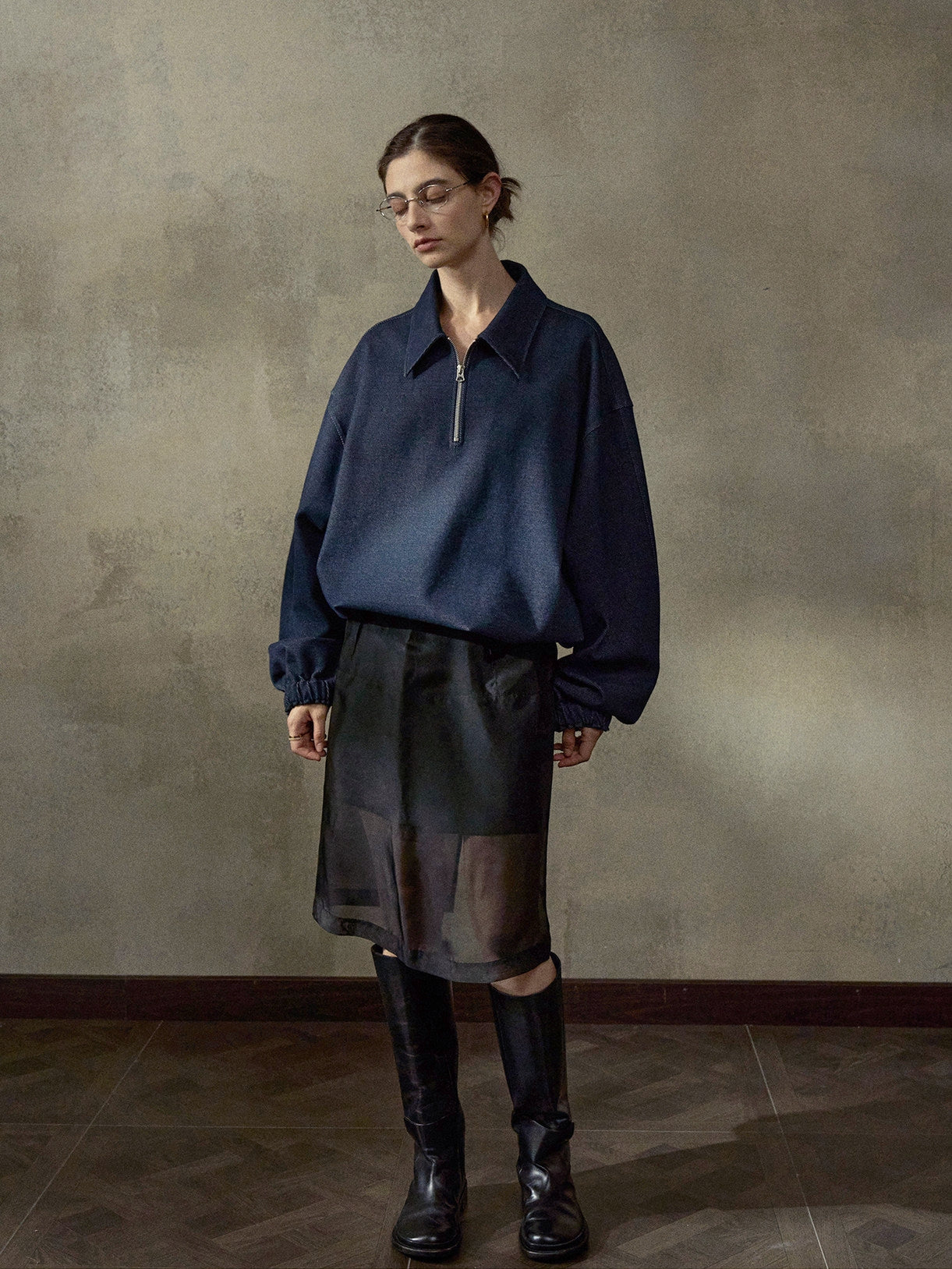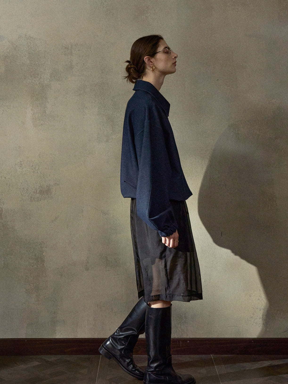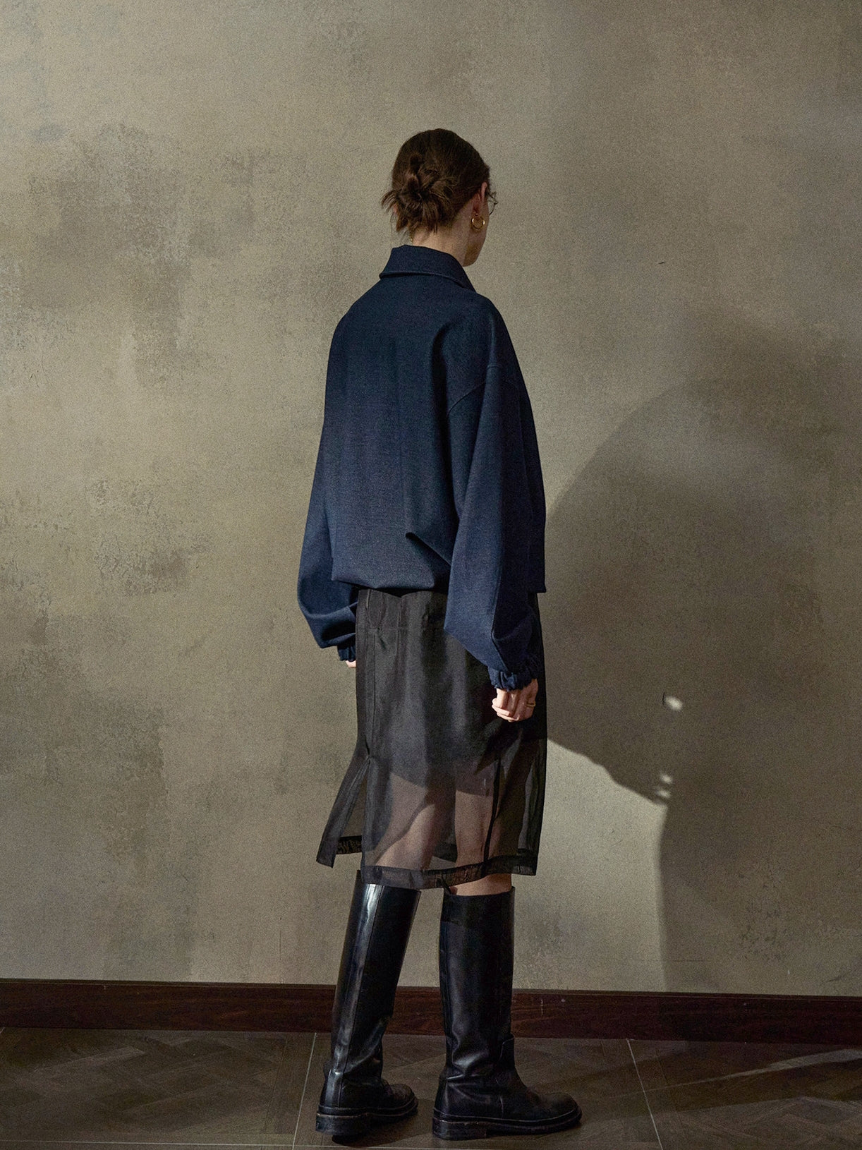 程よくフィットするミニスカートの上に、透け感のあるシアー生地を重ねることで、動くたびに奥行きのある表情を演出。