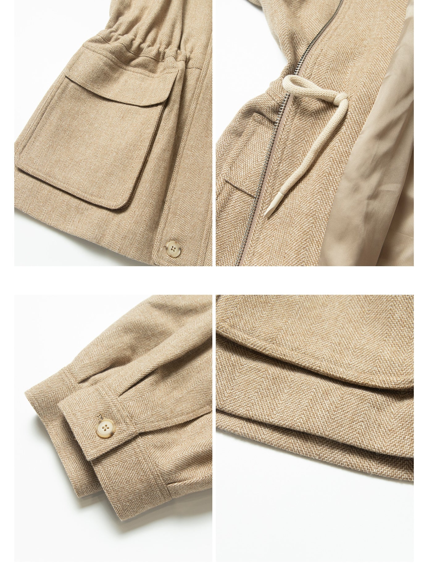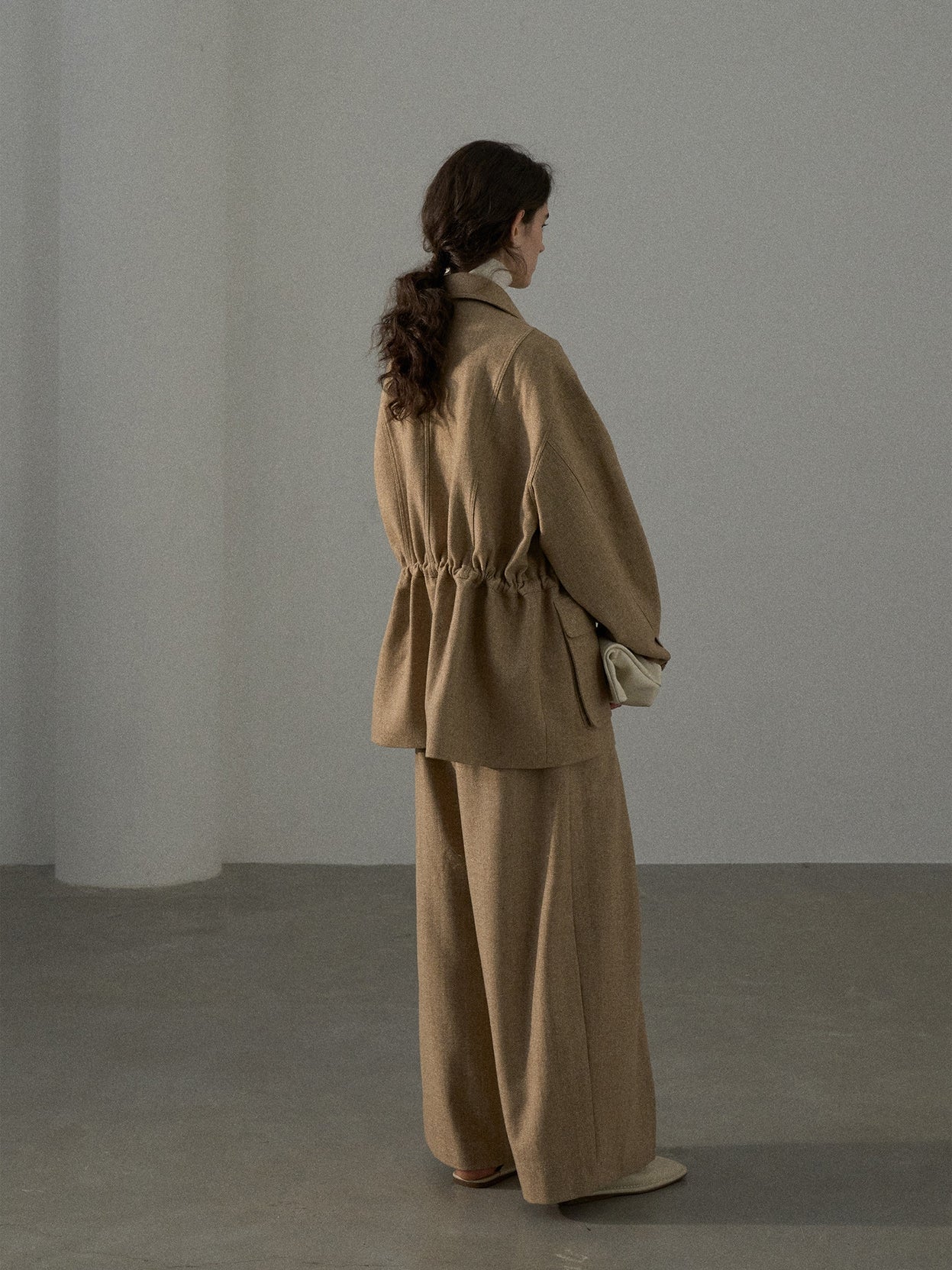 紐で調節可能なウエストは、メリハリのある印象に。