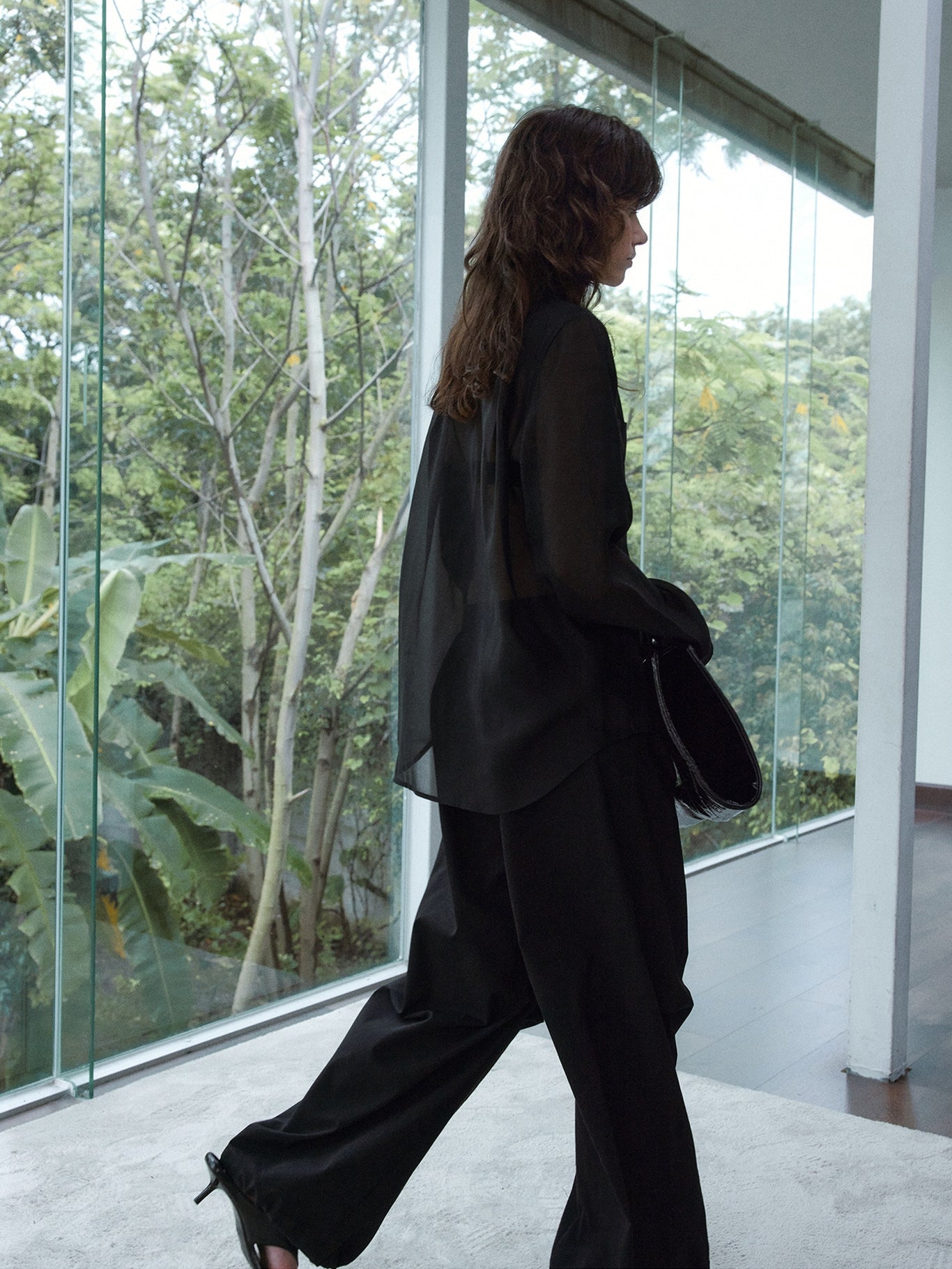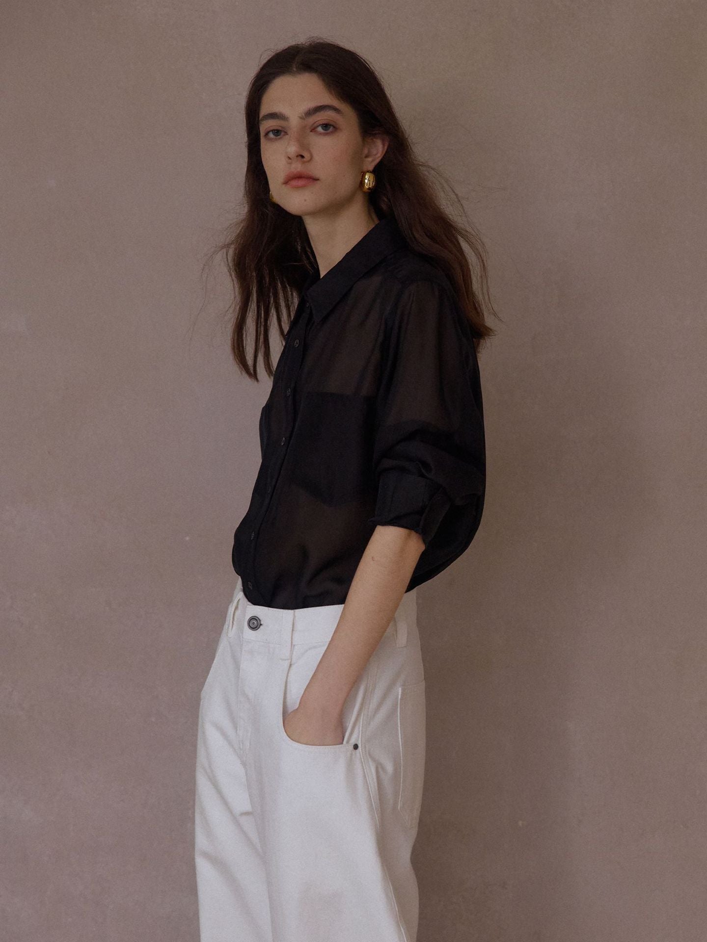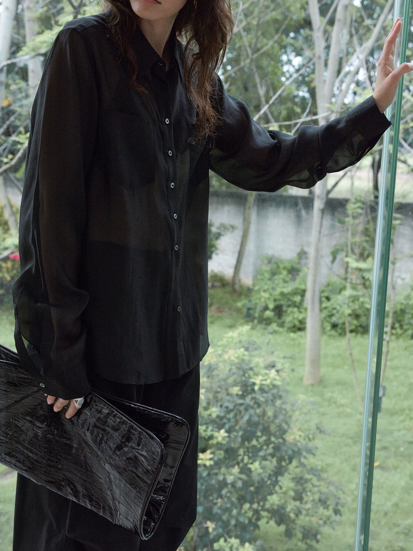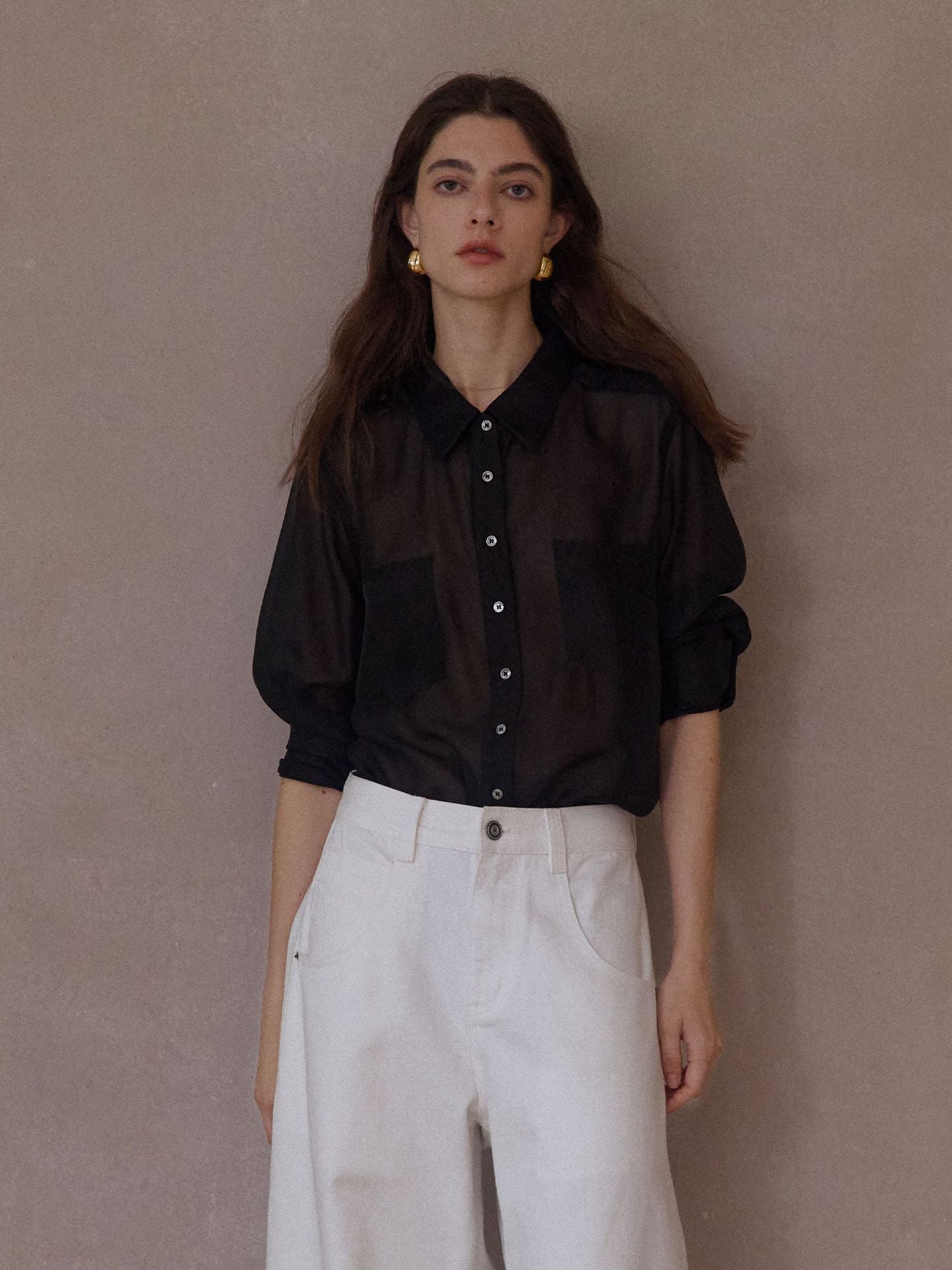 ベーシックな形にシックなムードを漂わせたシアーブラウス。