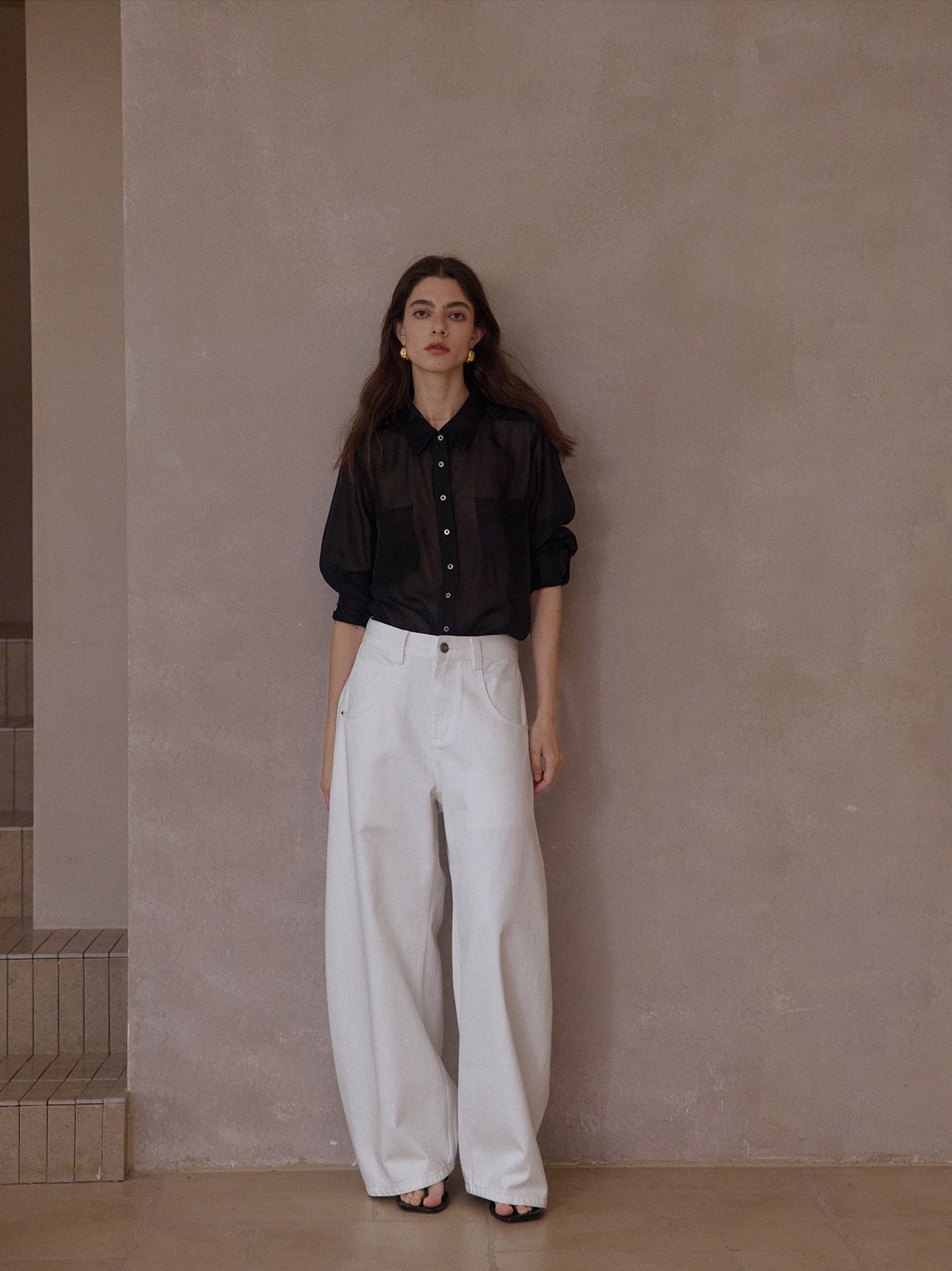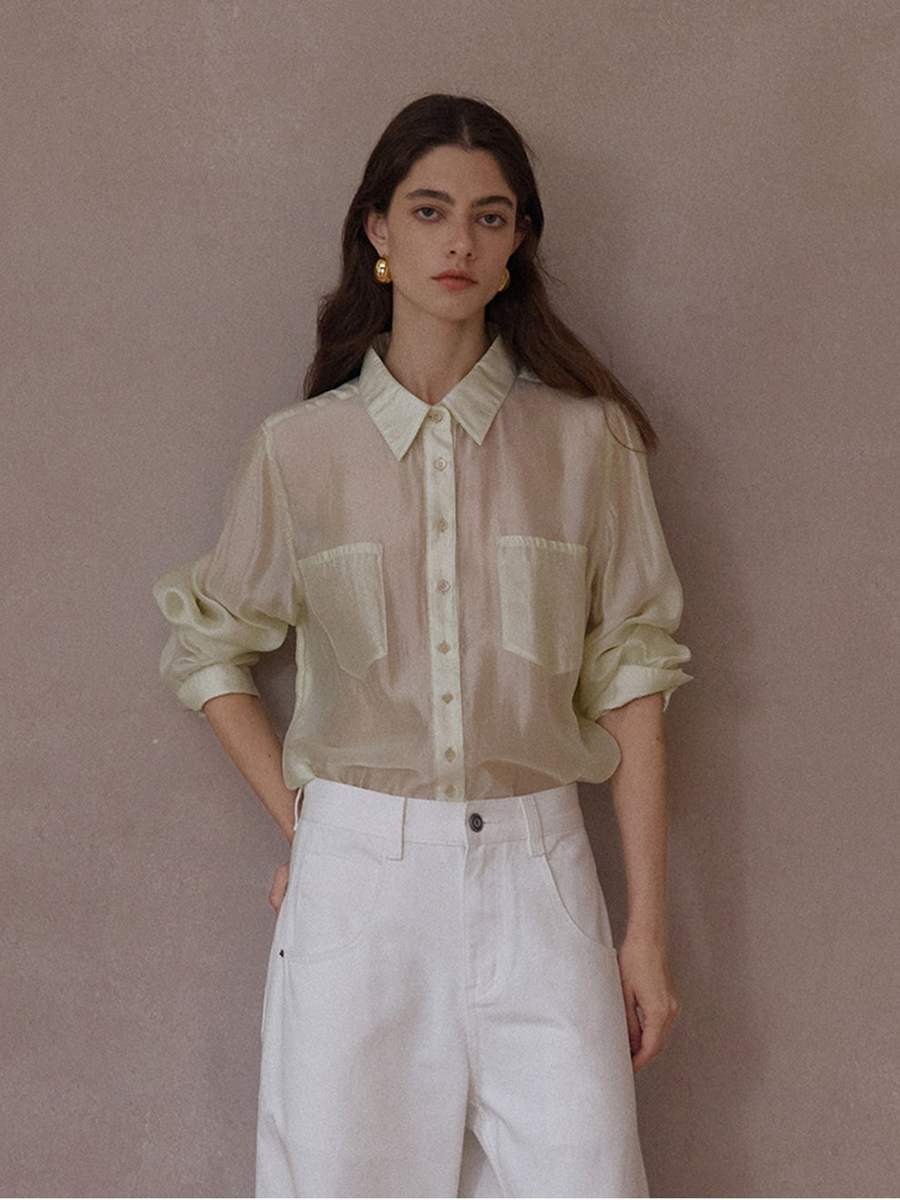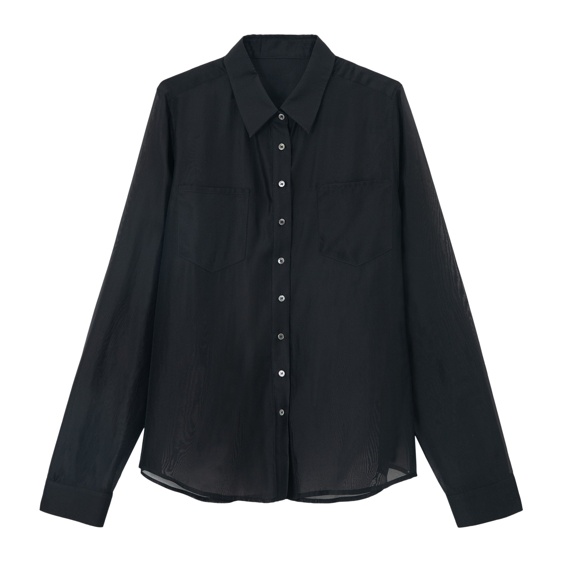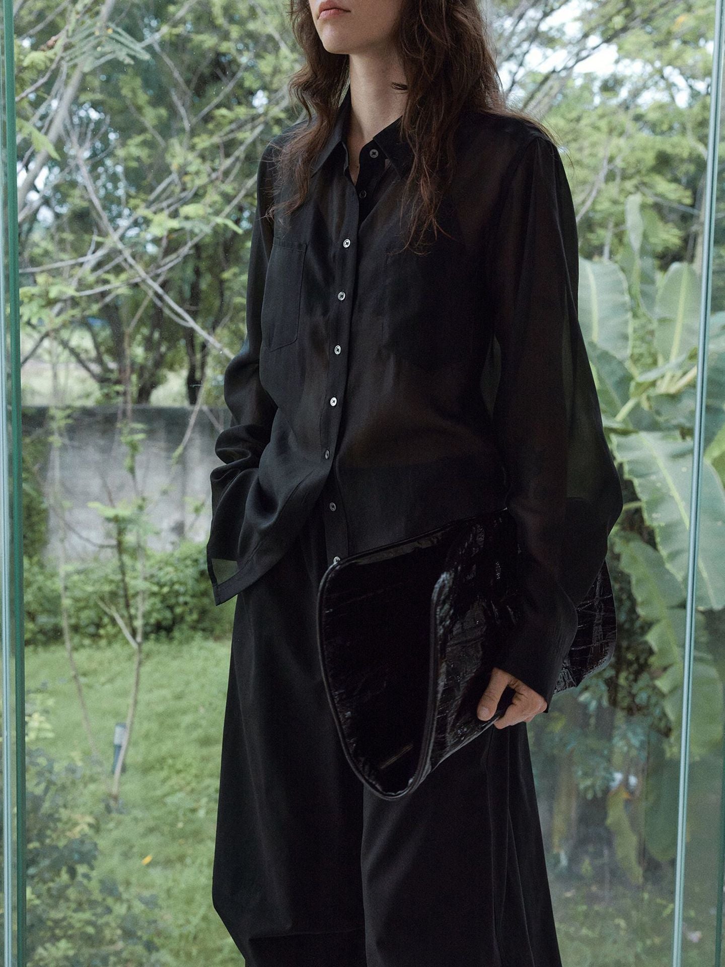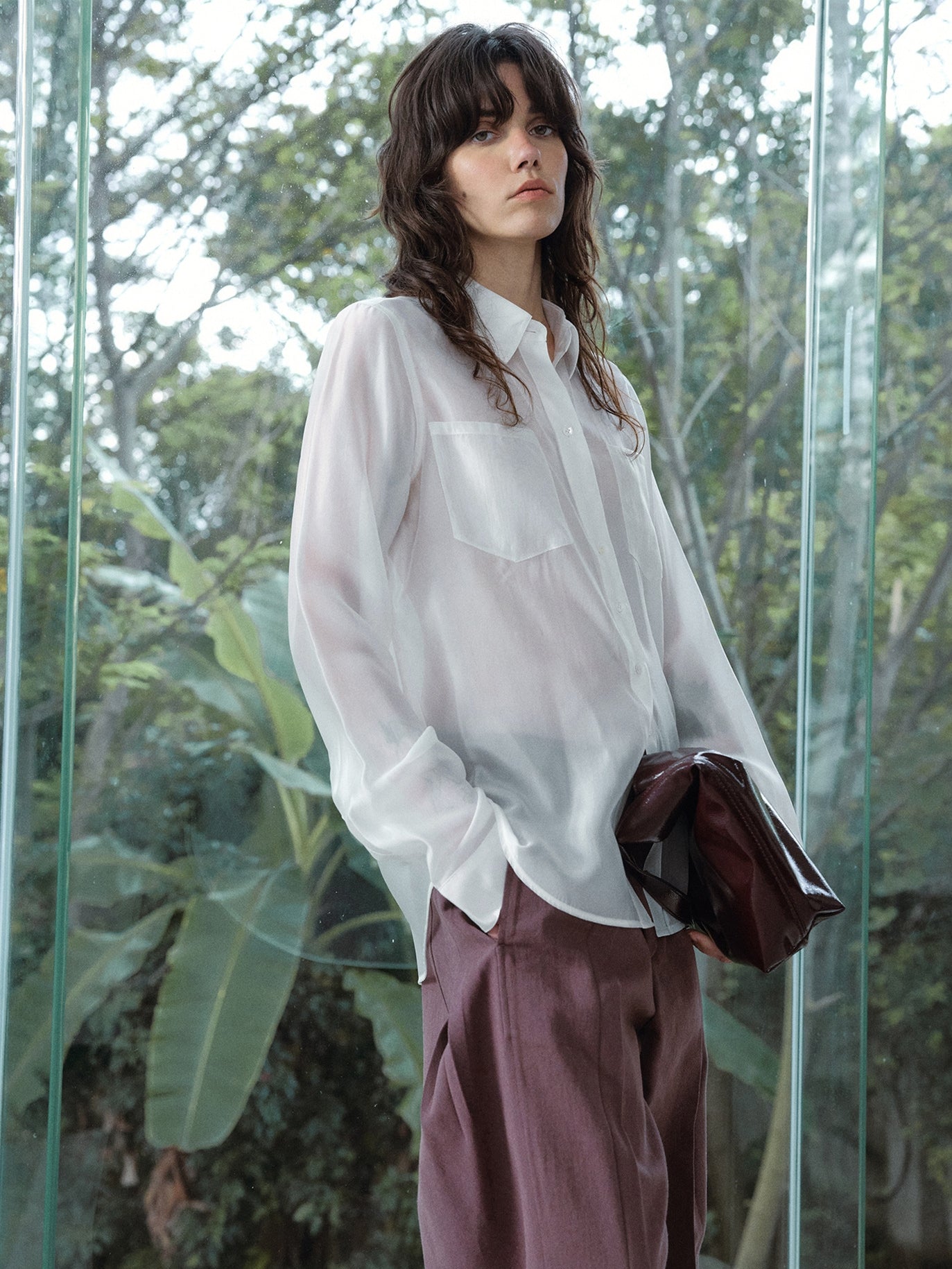 ベーシックな形にシックなムードを漂わせたシアーブラウス。