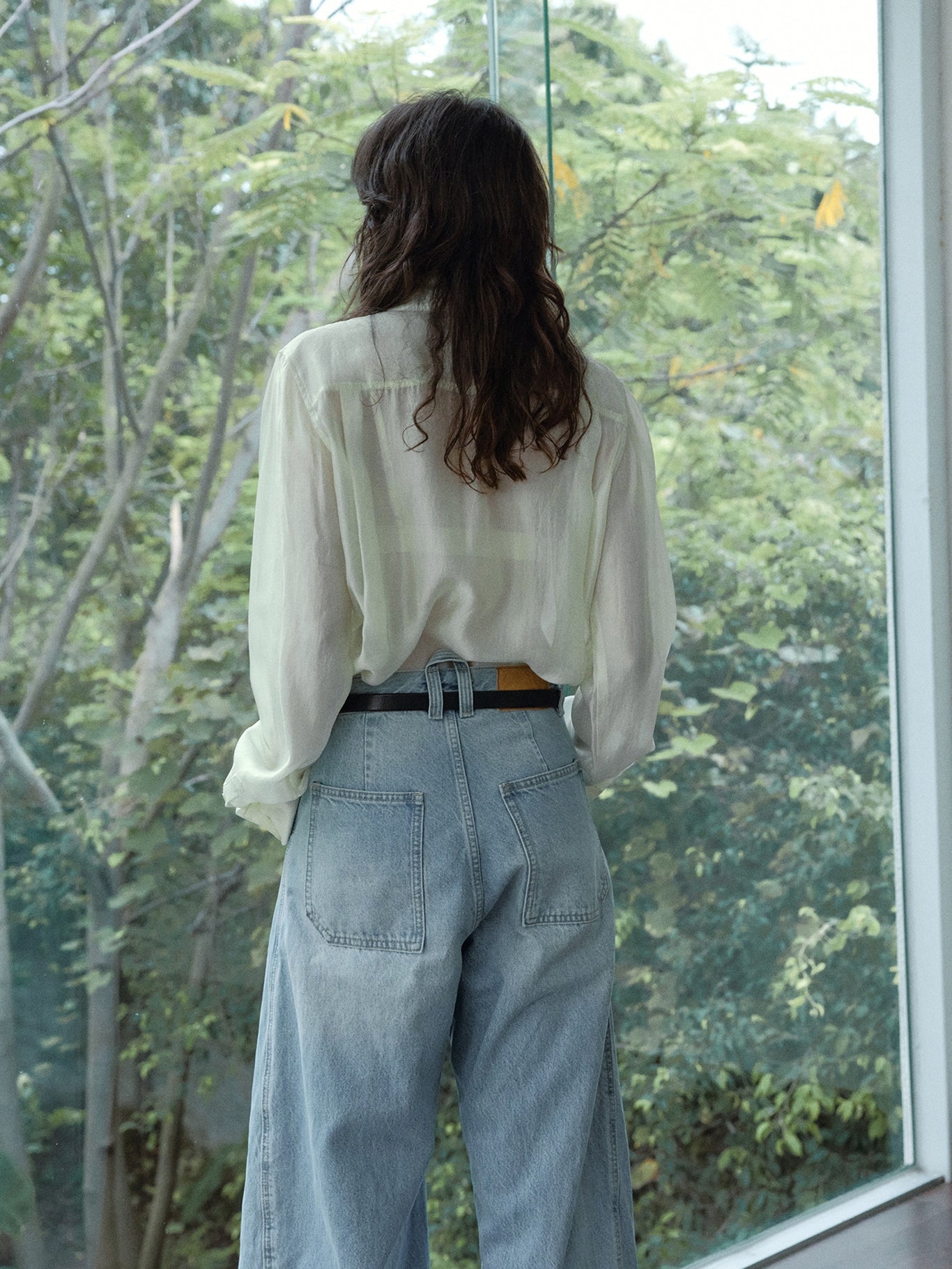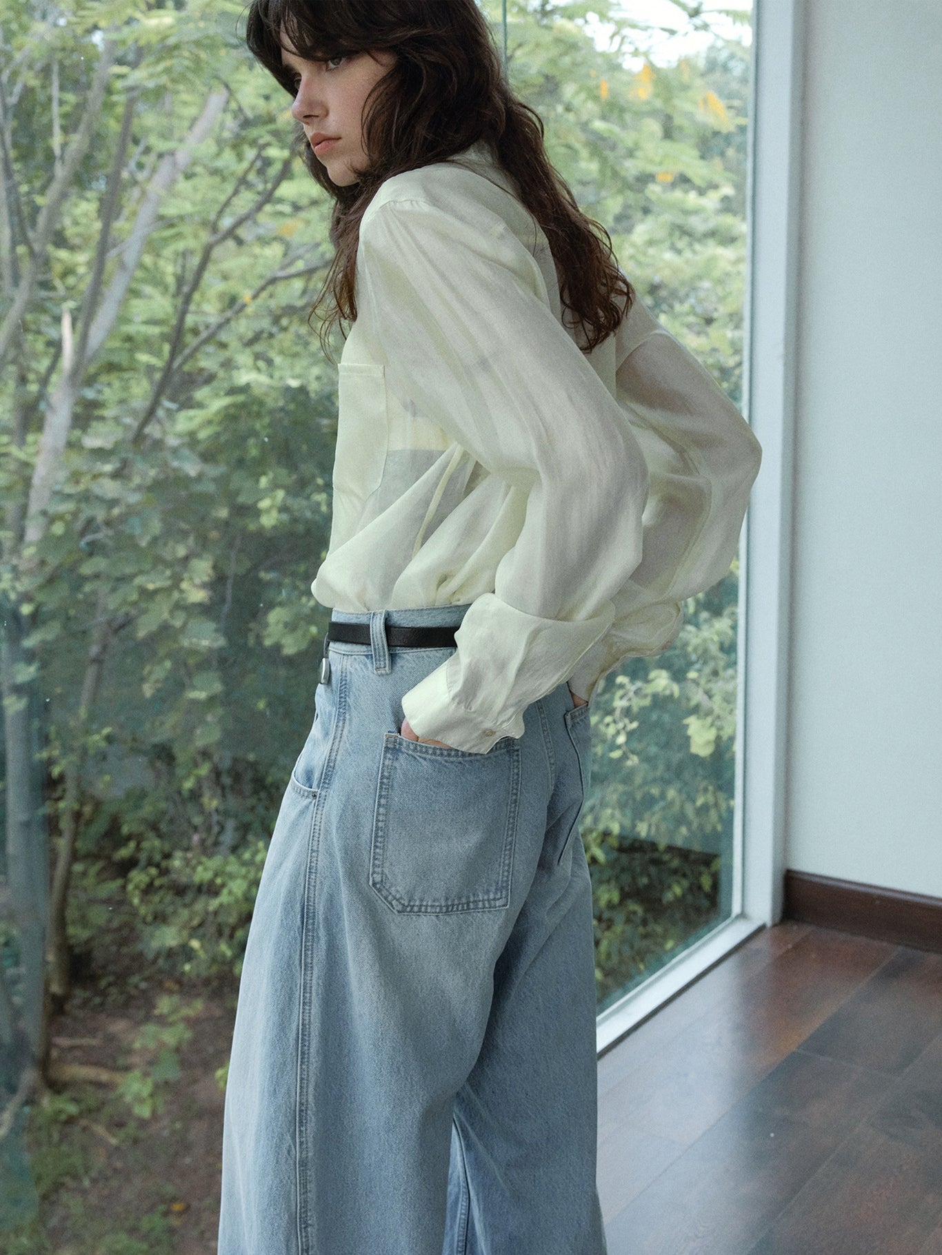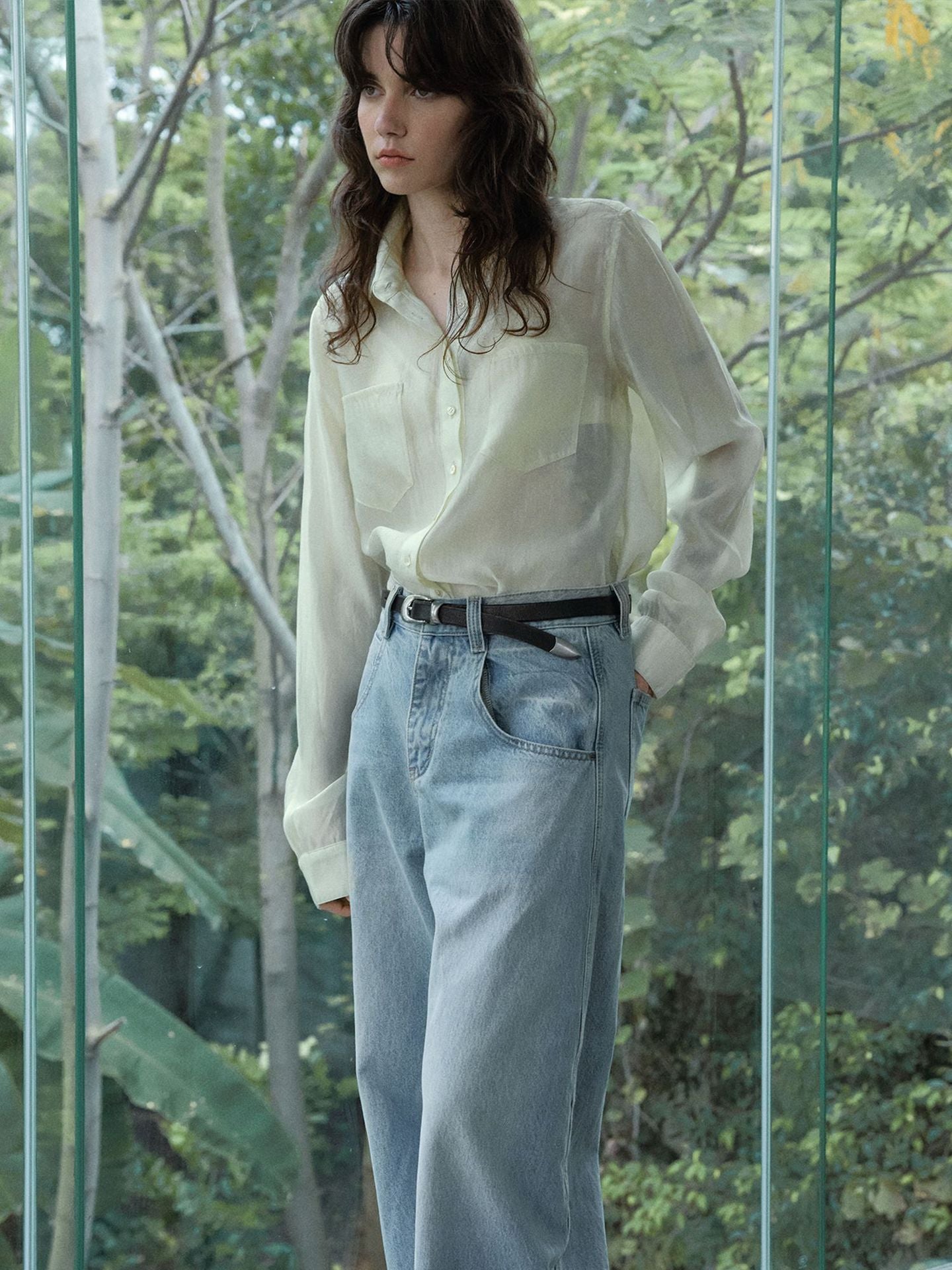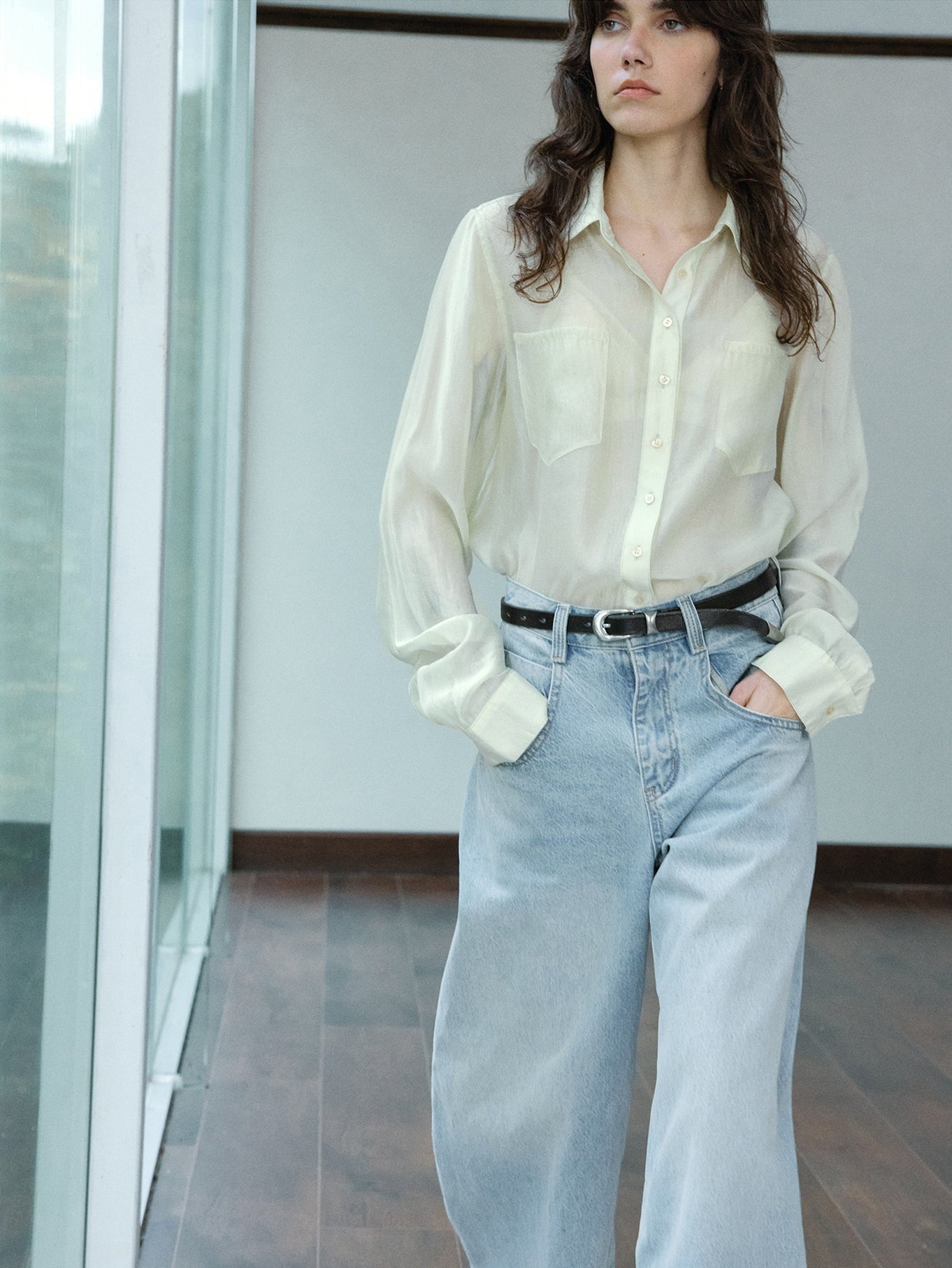 ベーシックな形にシックなムードを漂わせたシアーブラウス。