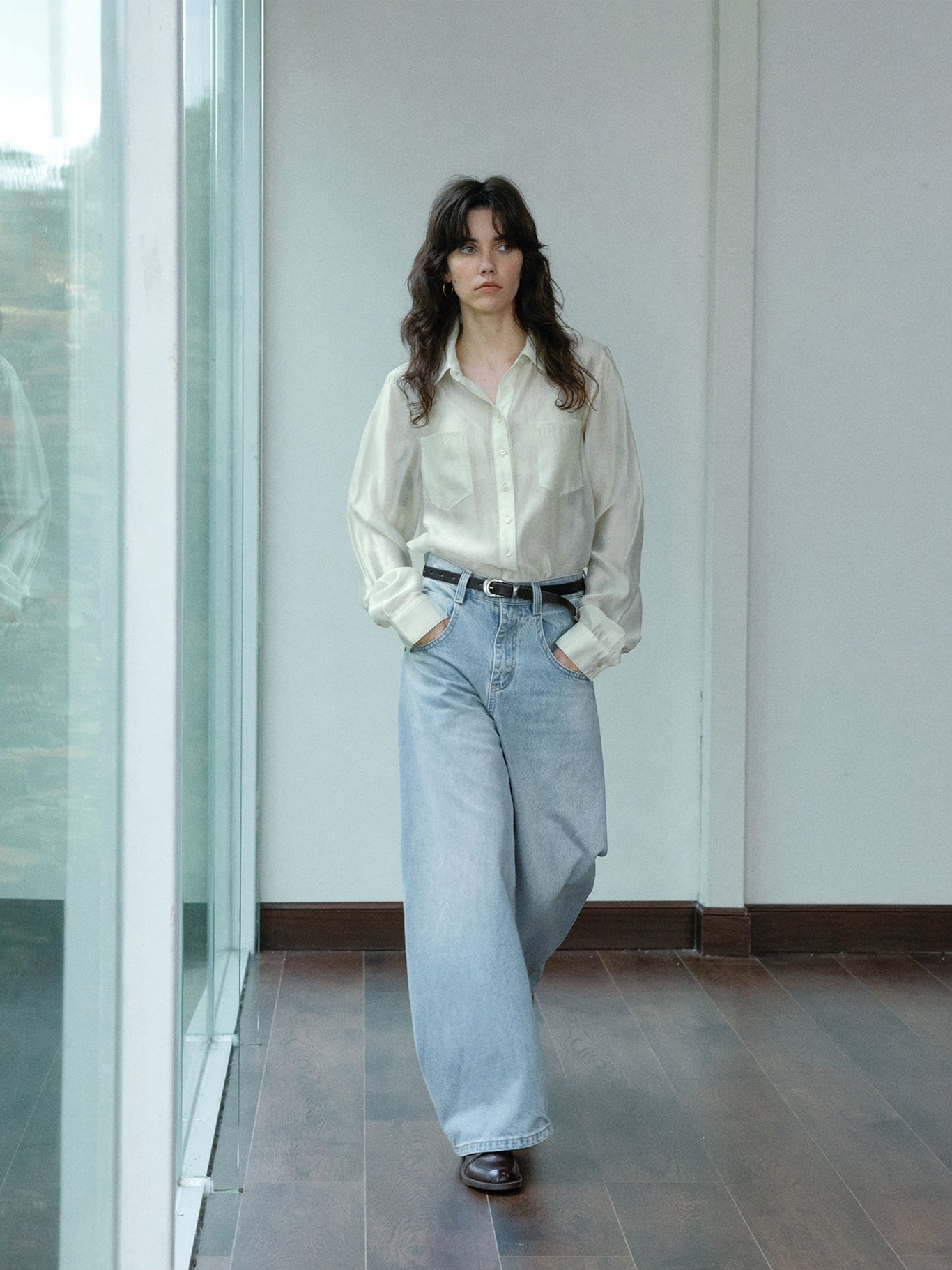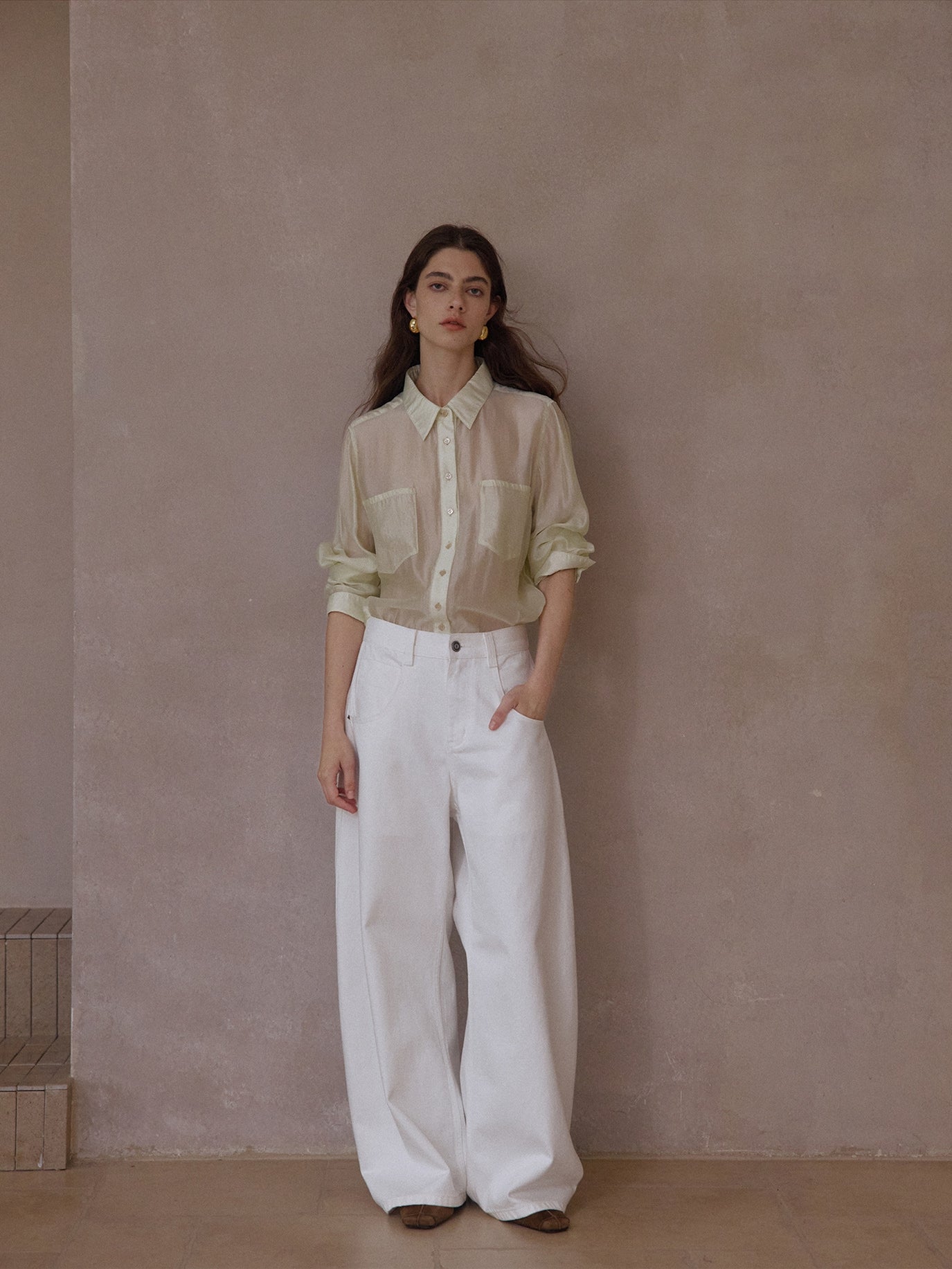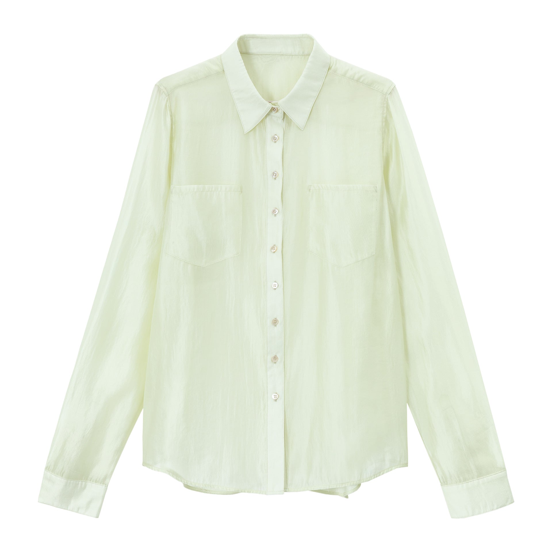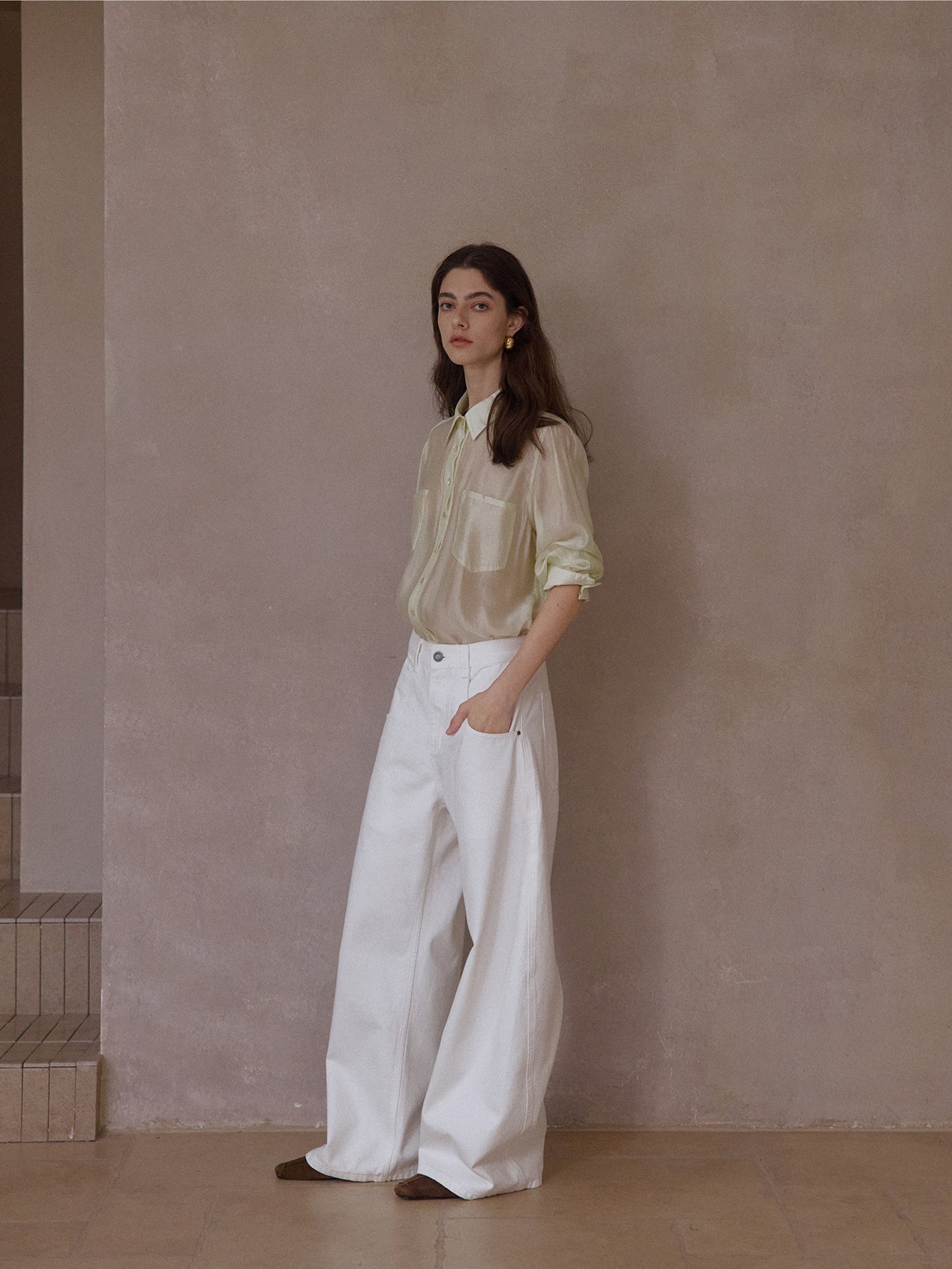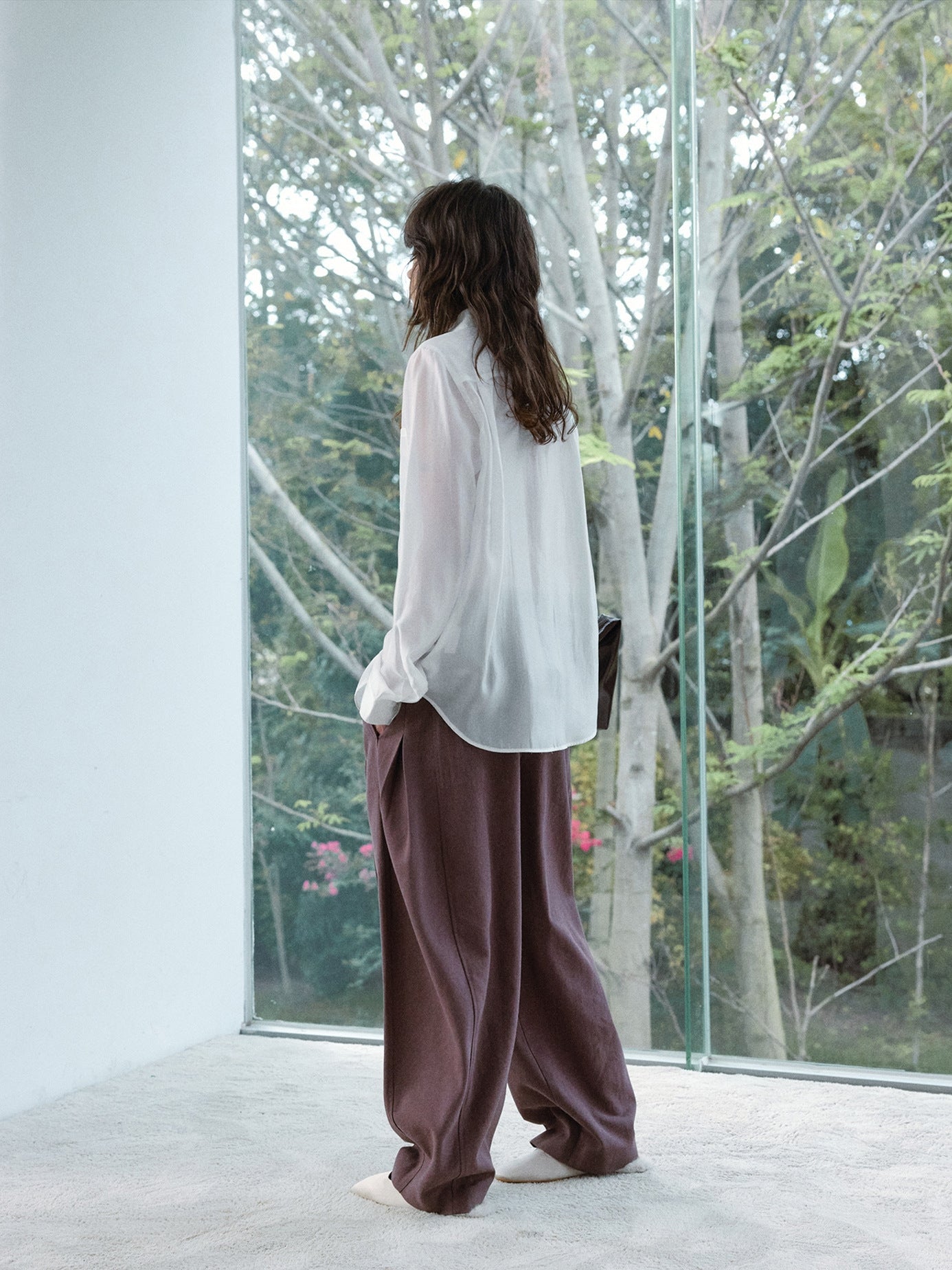 ベーシックな形にシックなムードを漂わせたシアーブラウス。