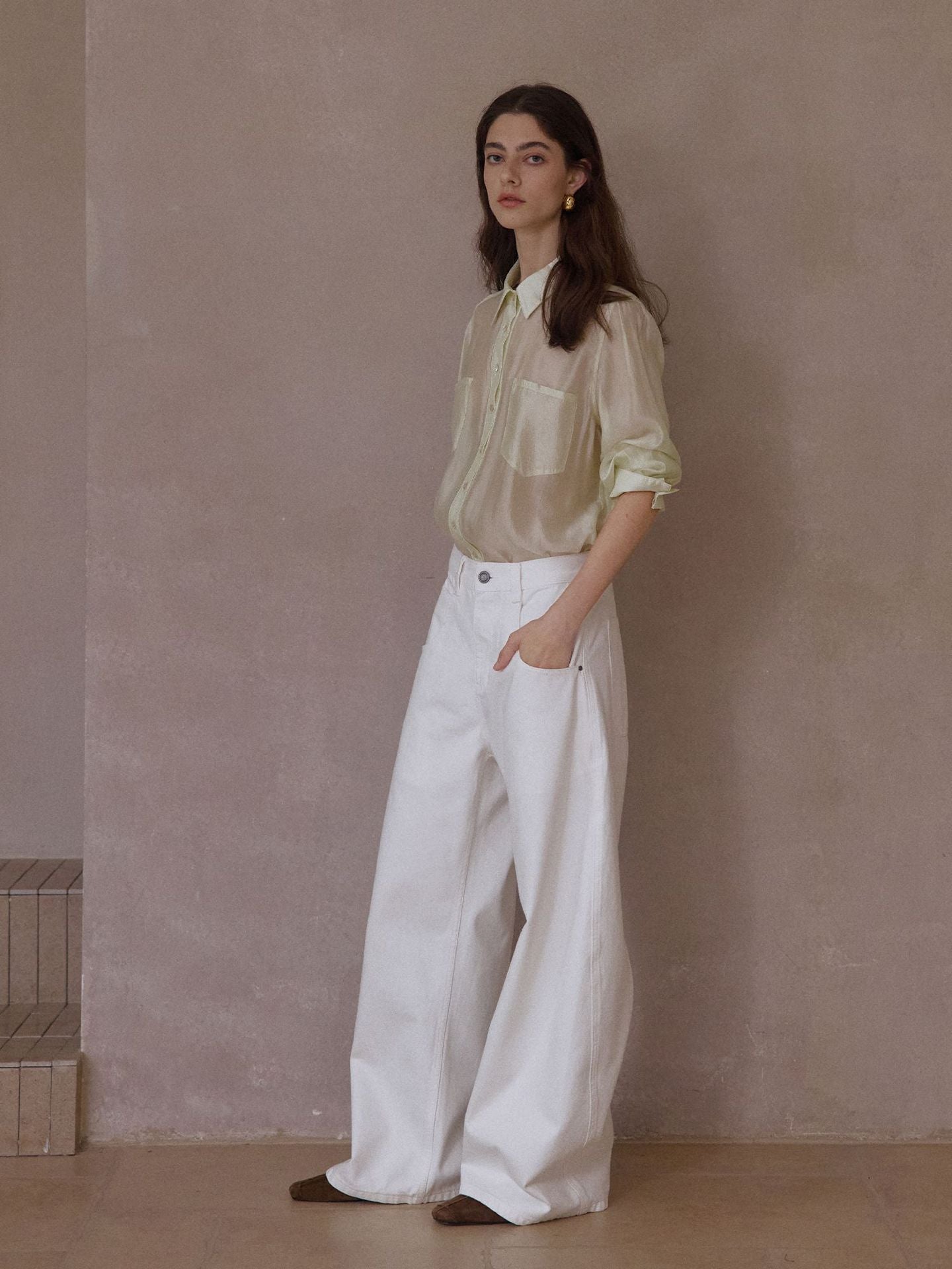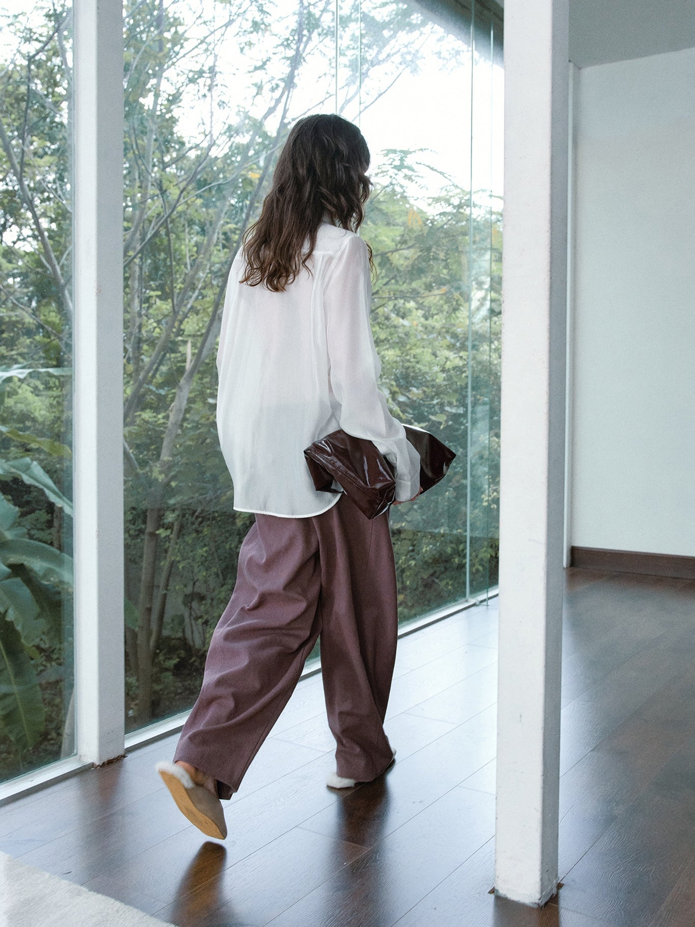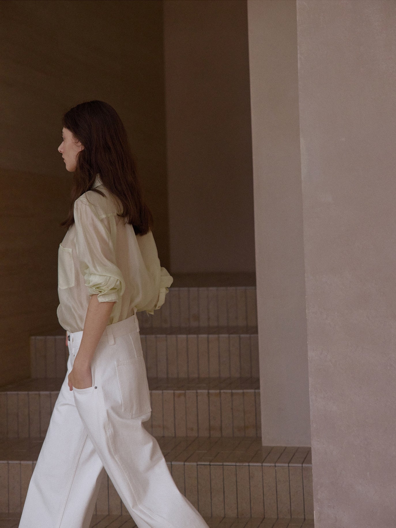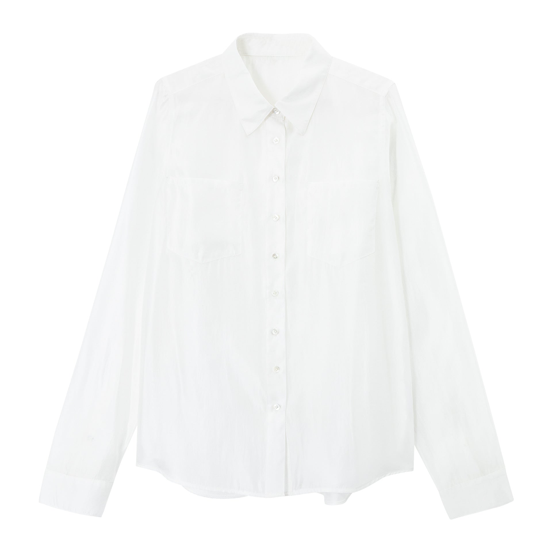 ベーシックな形にシックなムードを漂わせたシアーブラウス。