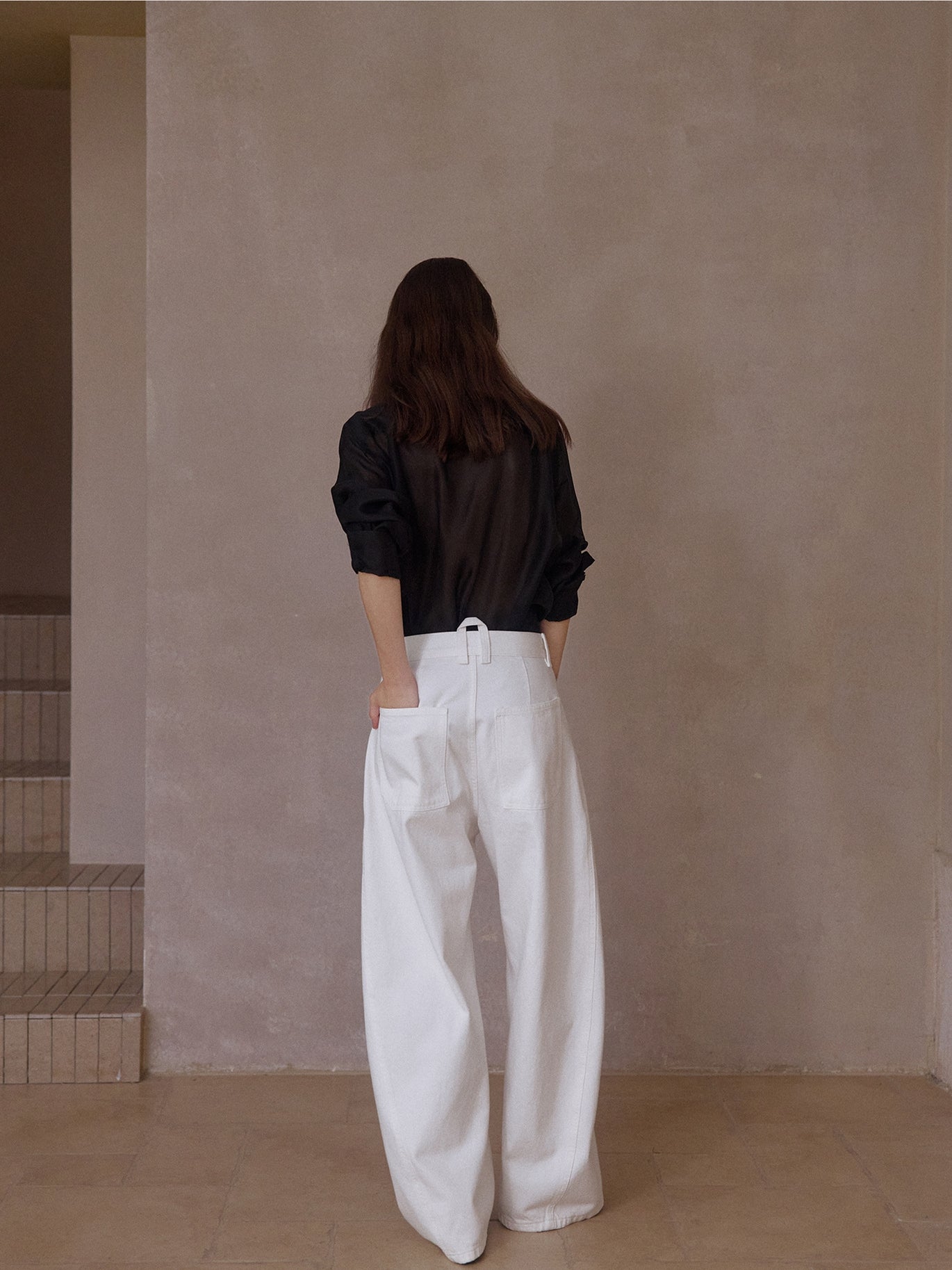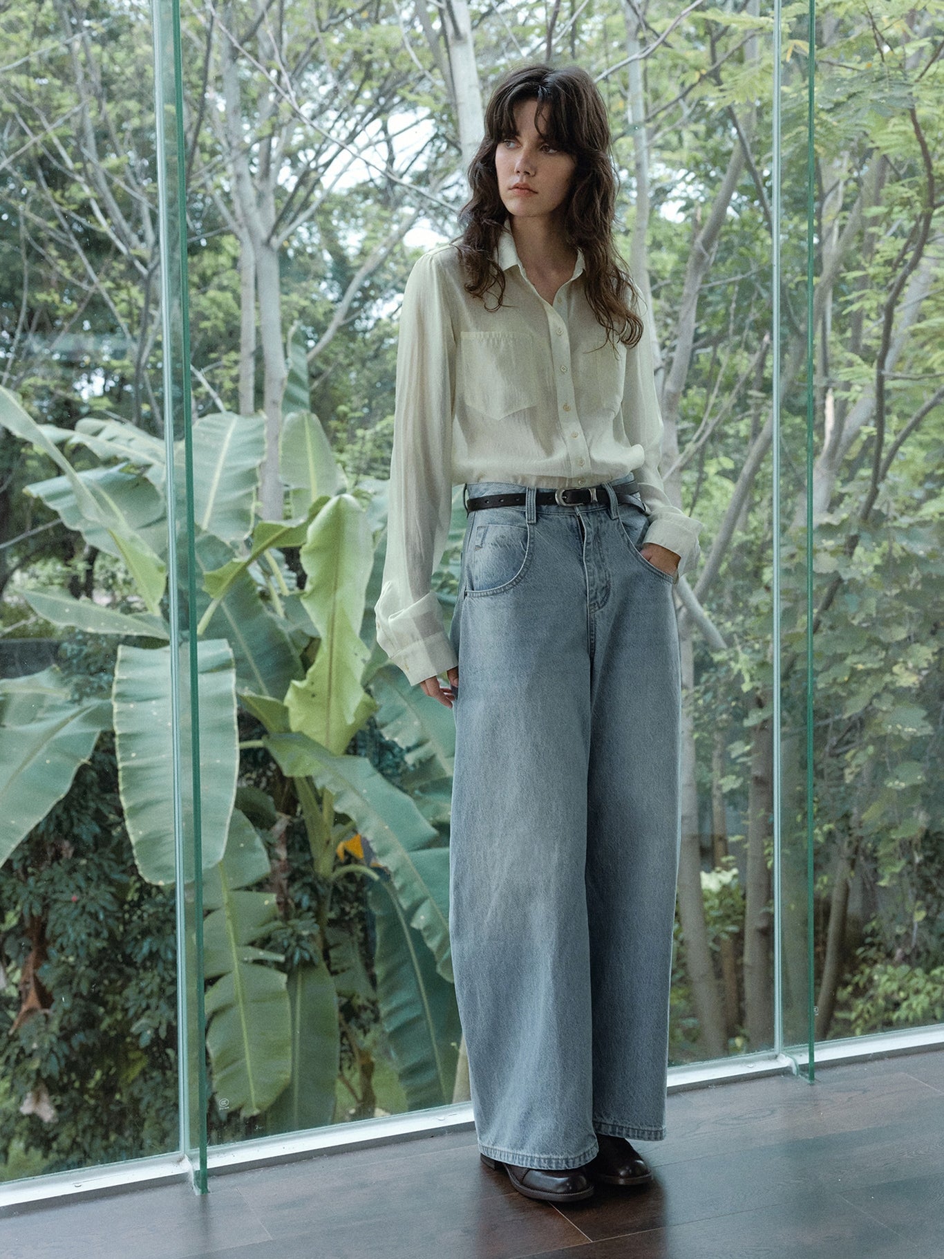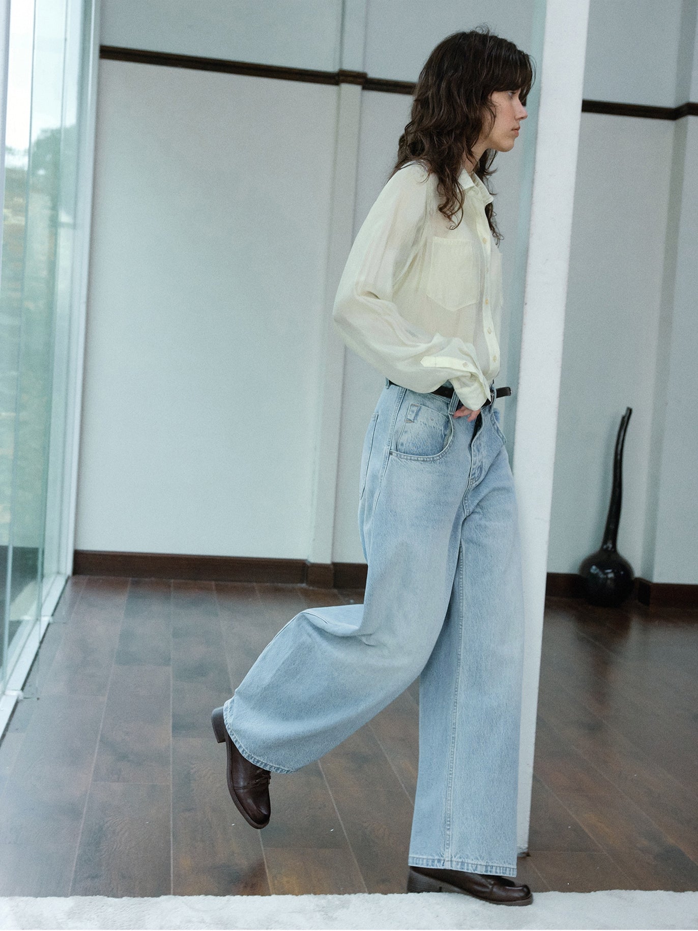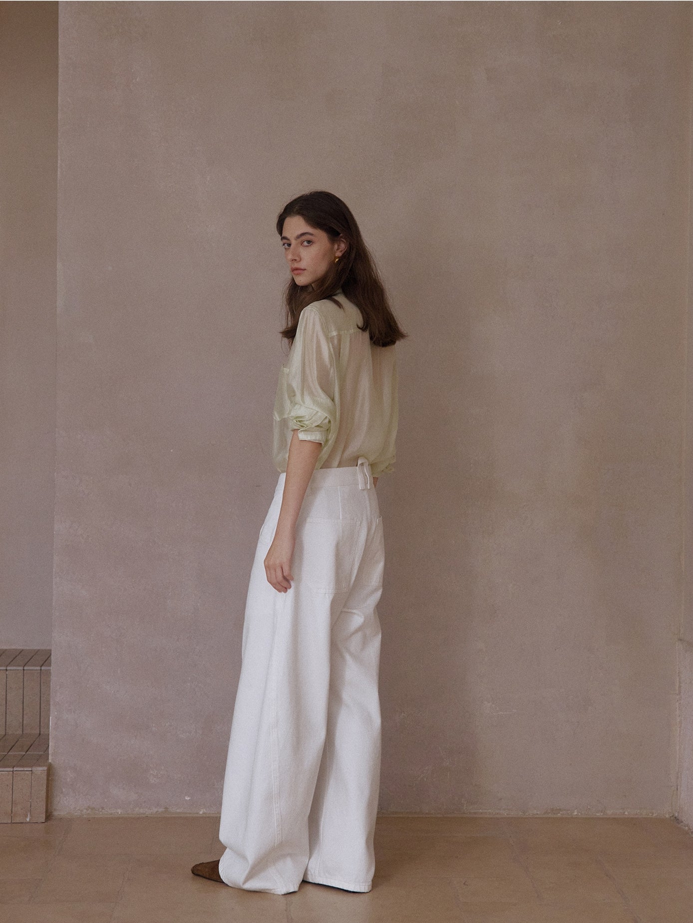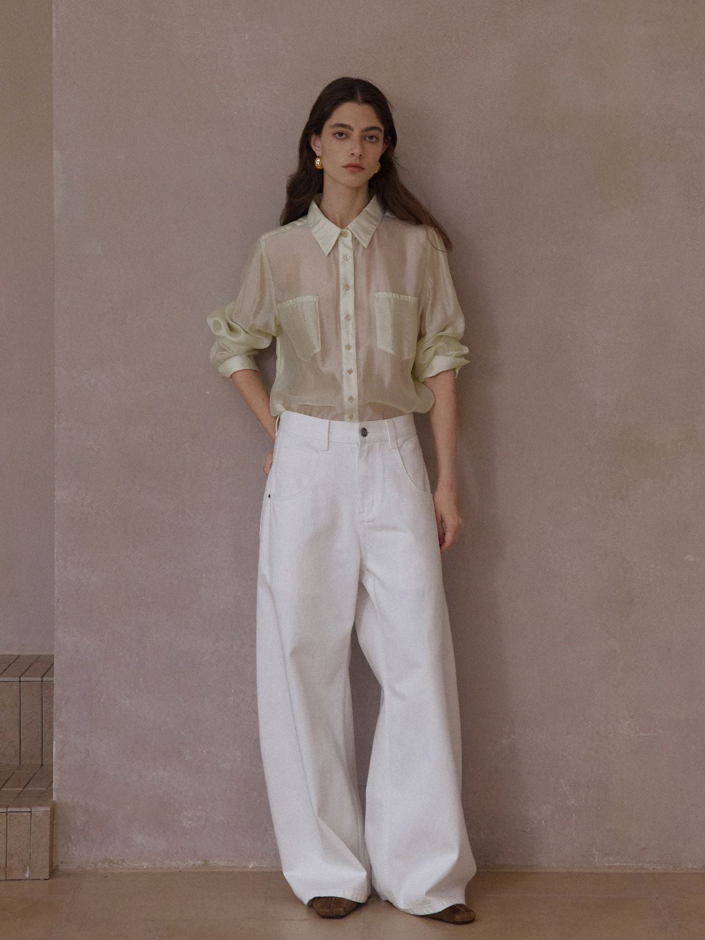 ベーシックな形にシックなムードを漂わせたシアーブラウス。