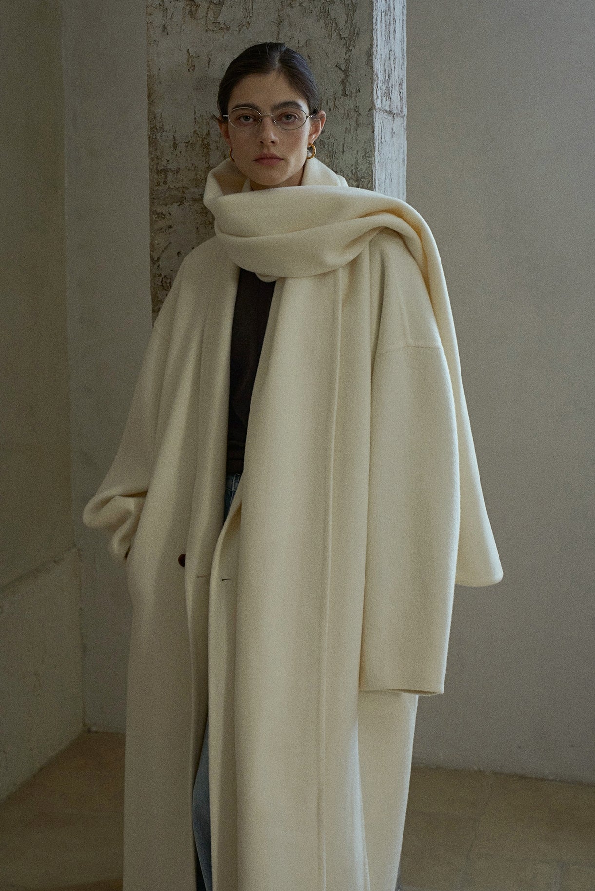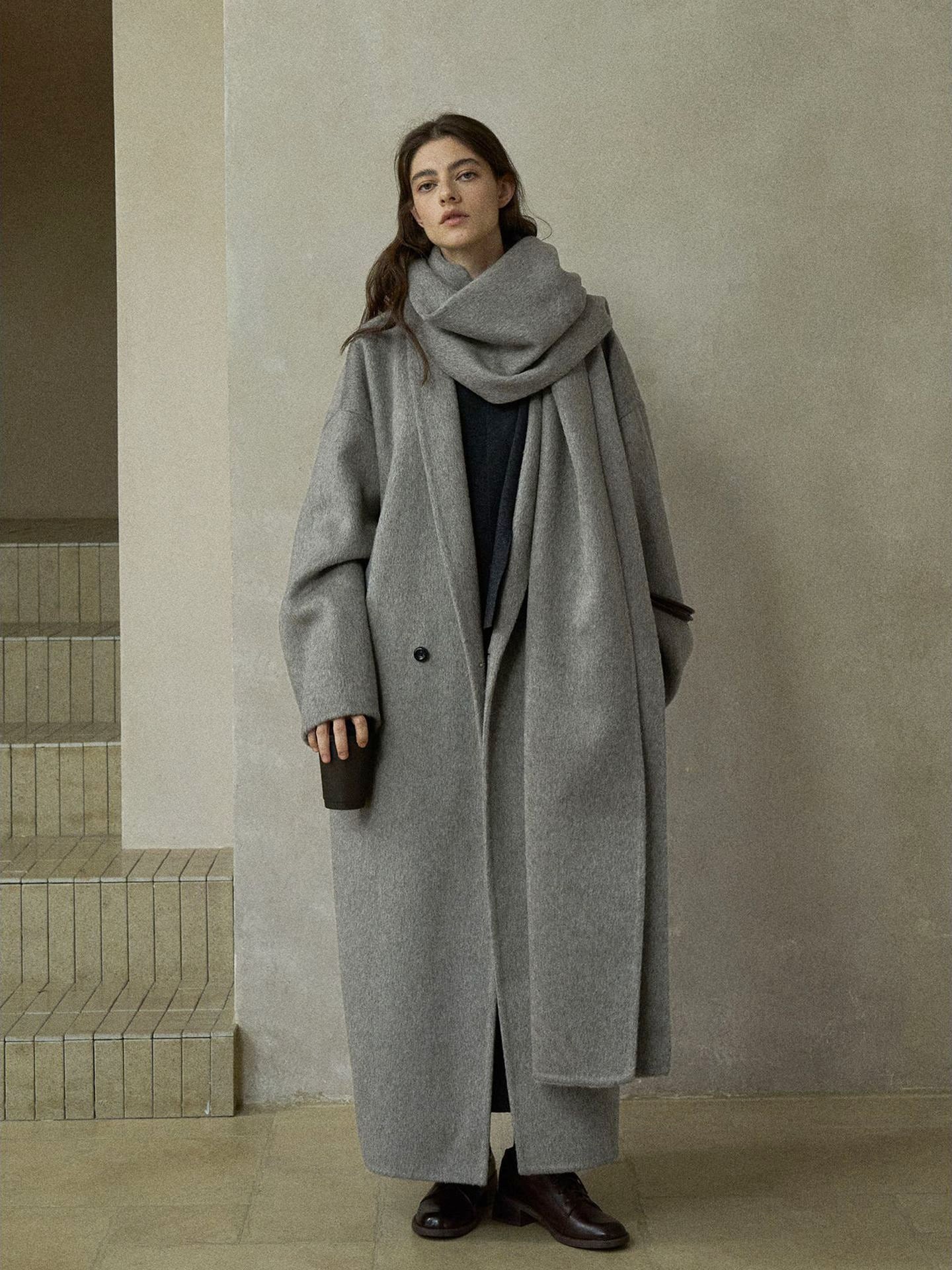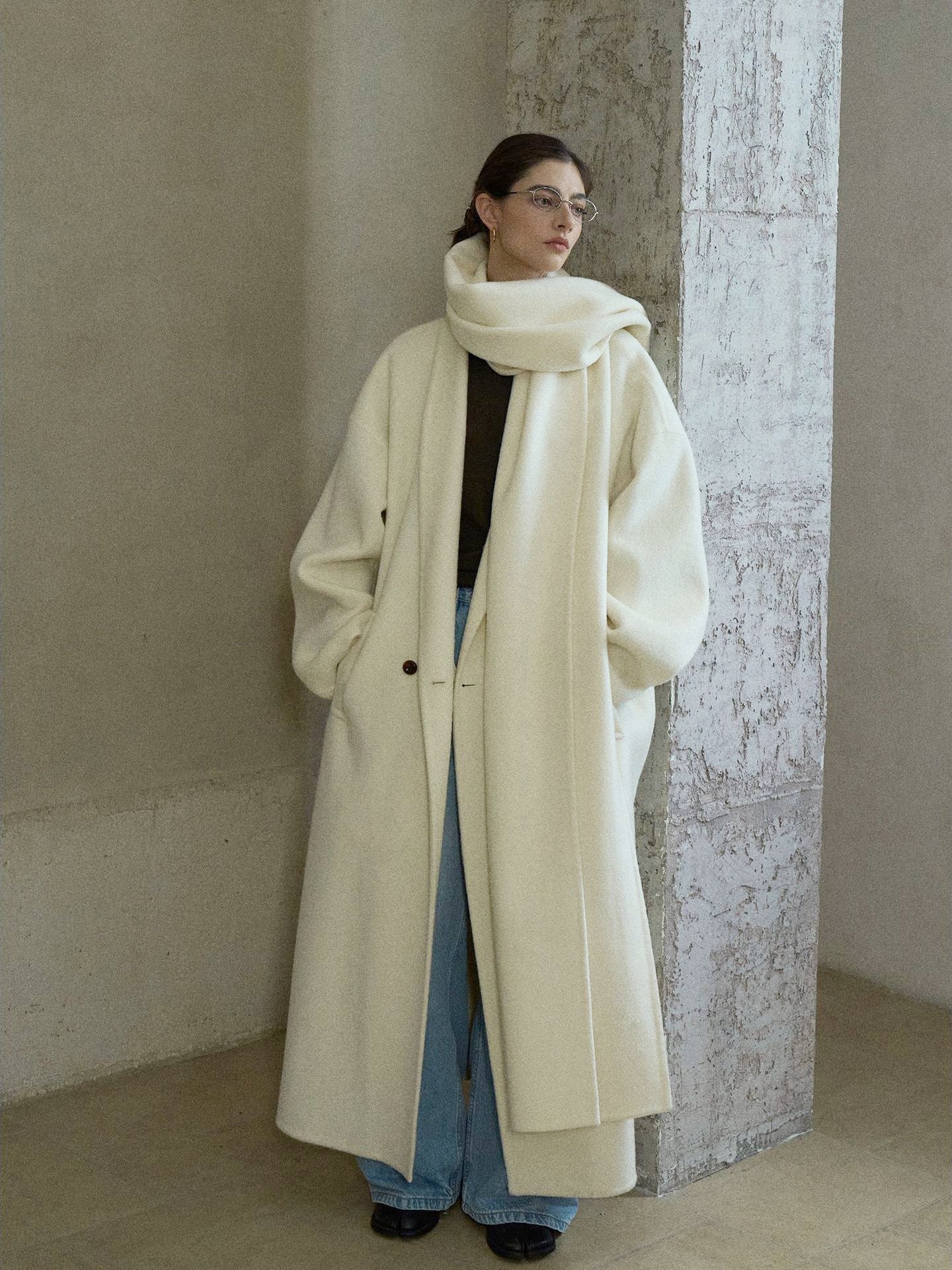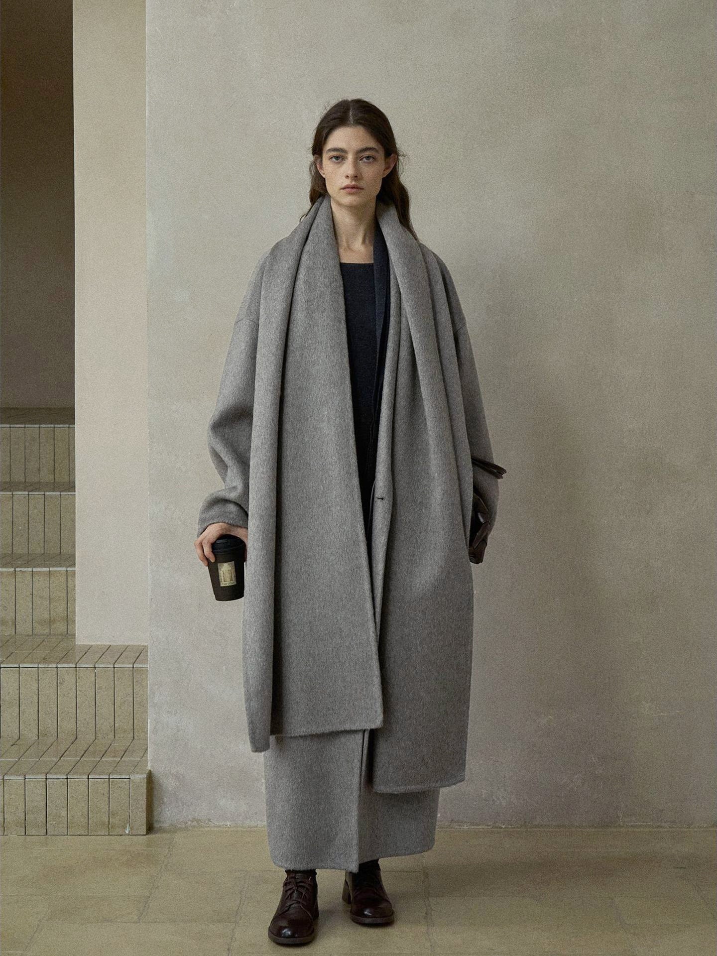 「ショールカラーロングコート」とセットが可能なウール混マフラー。