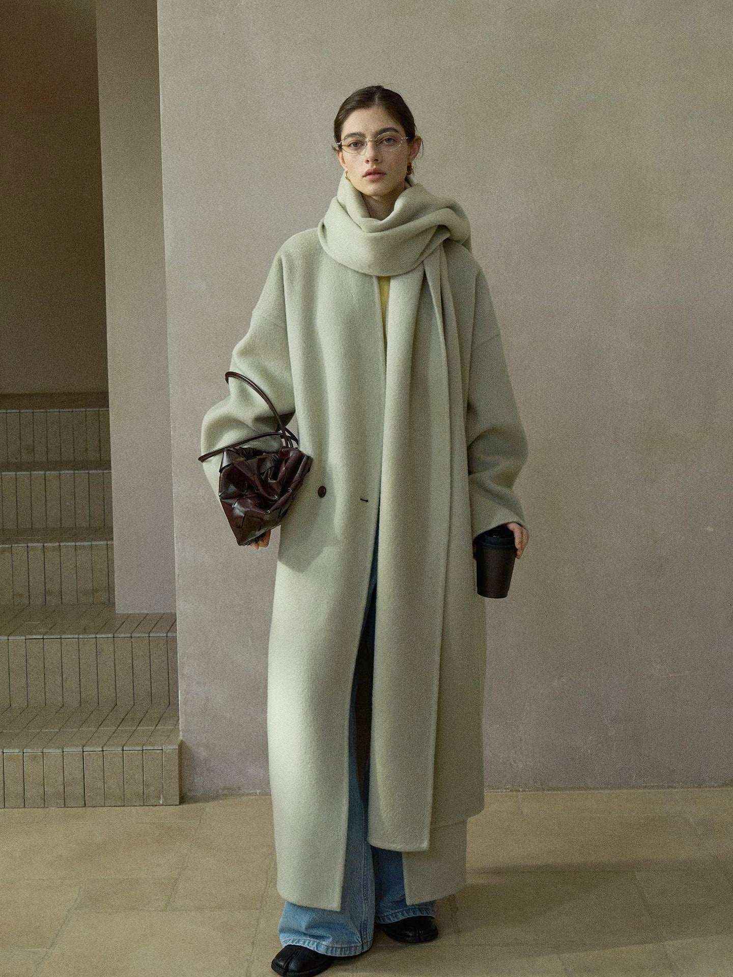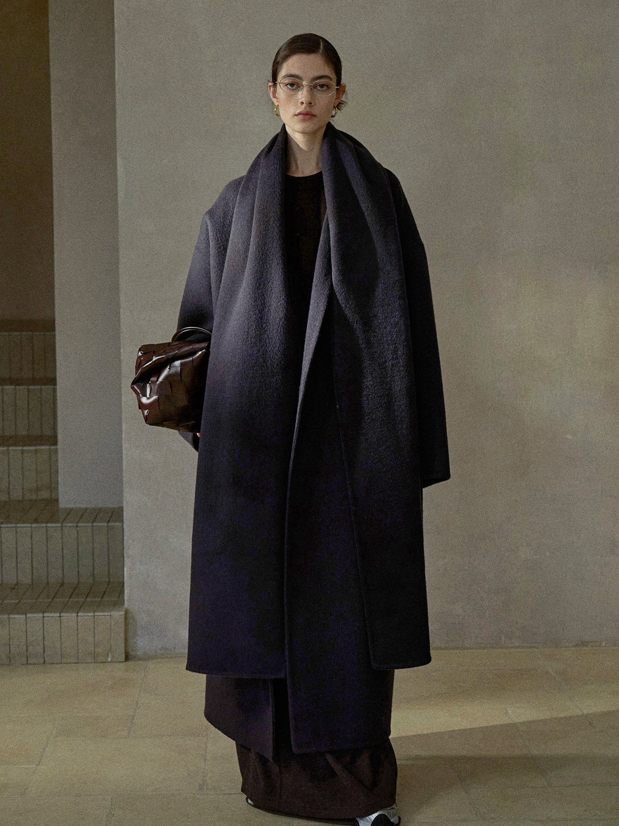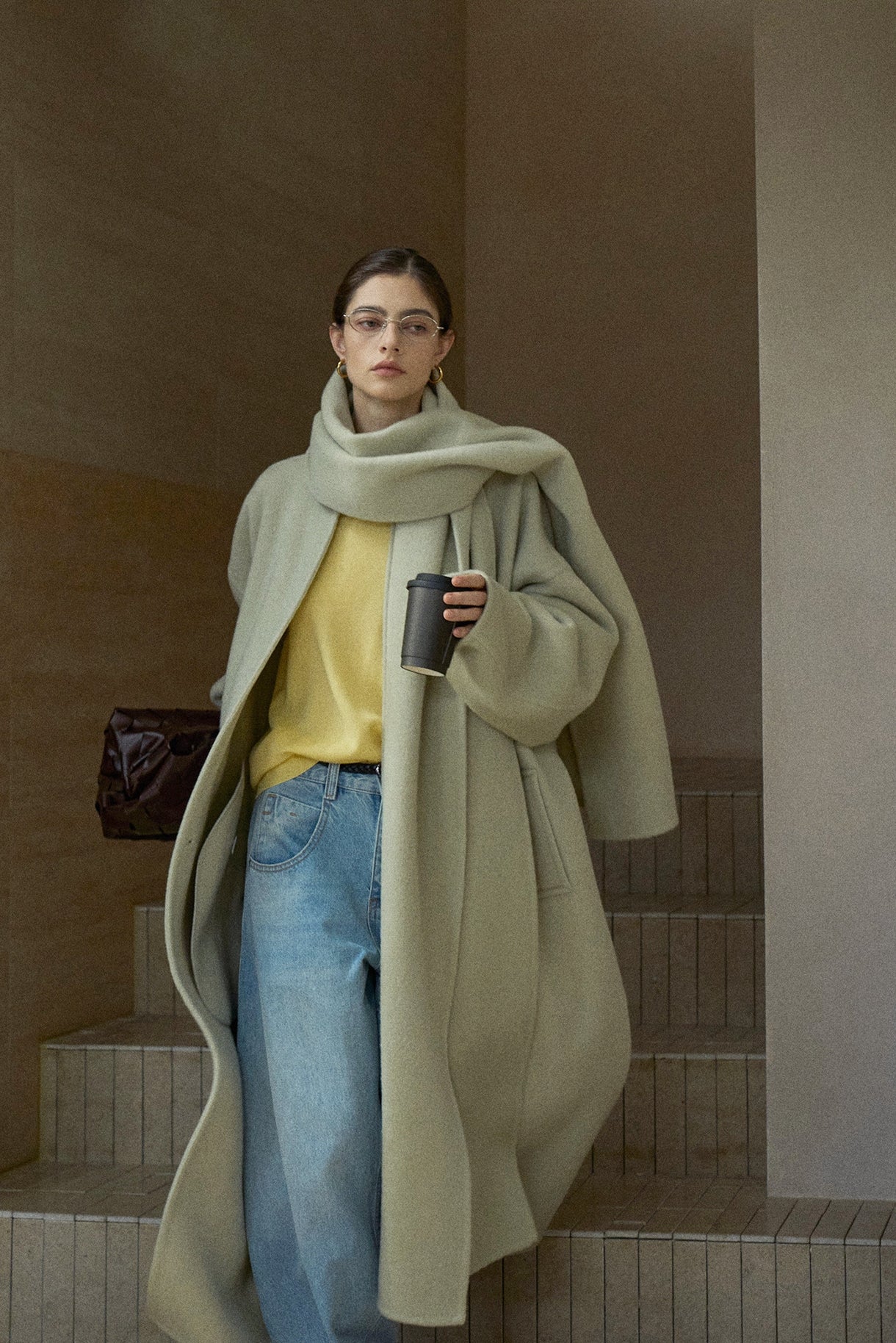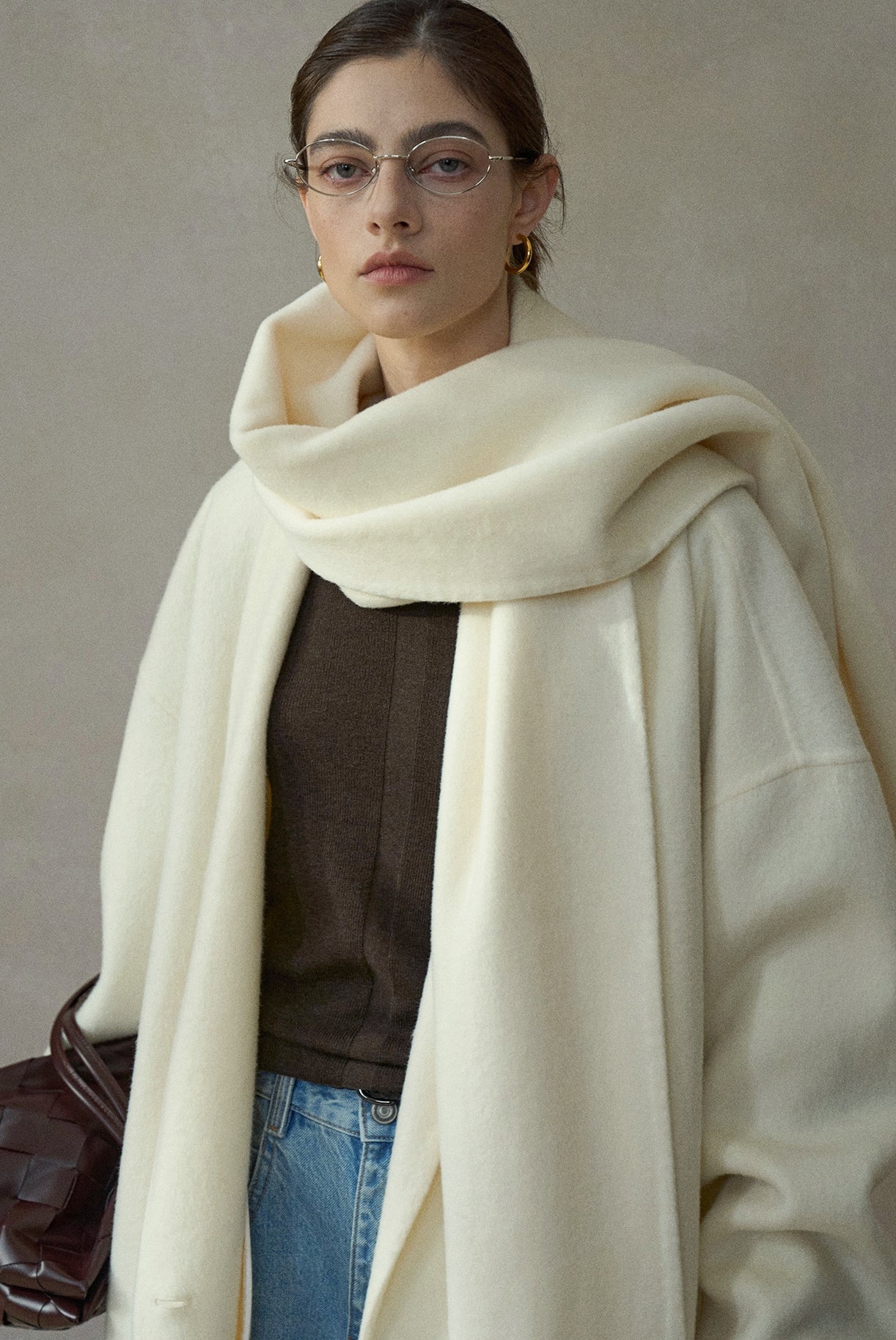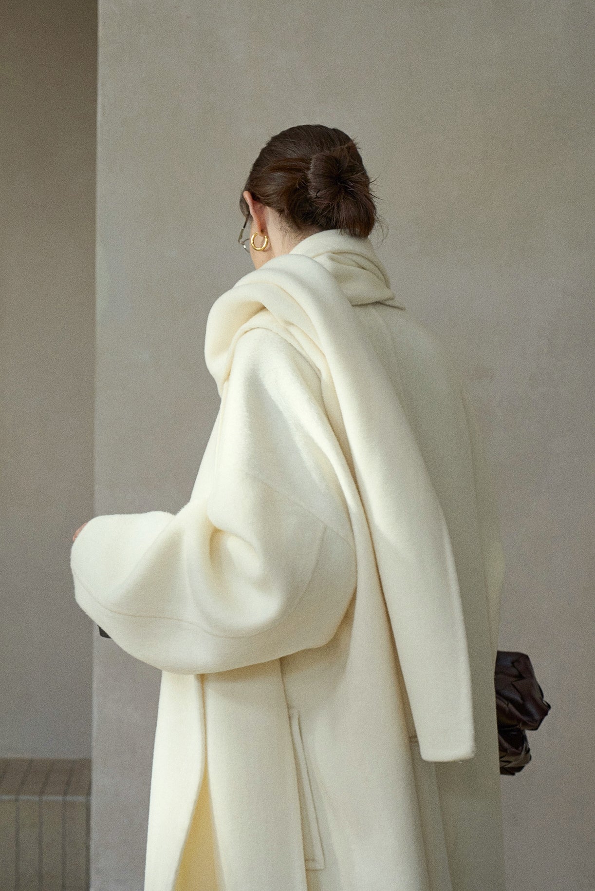 「ショールカラーロングコート」とセットが可能なウール混マフラー。