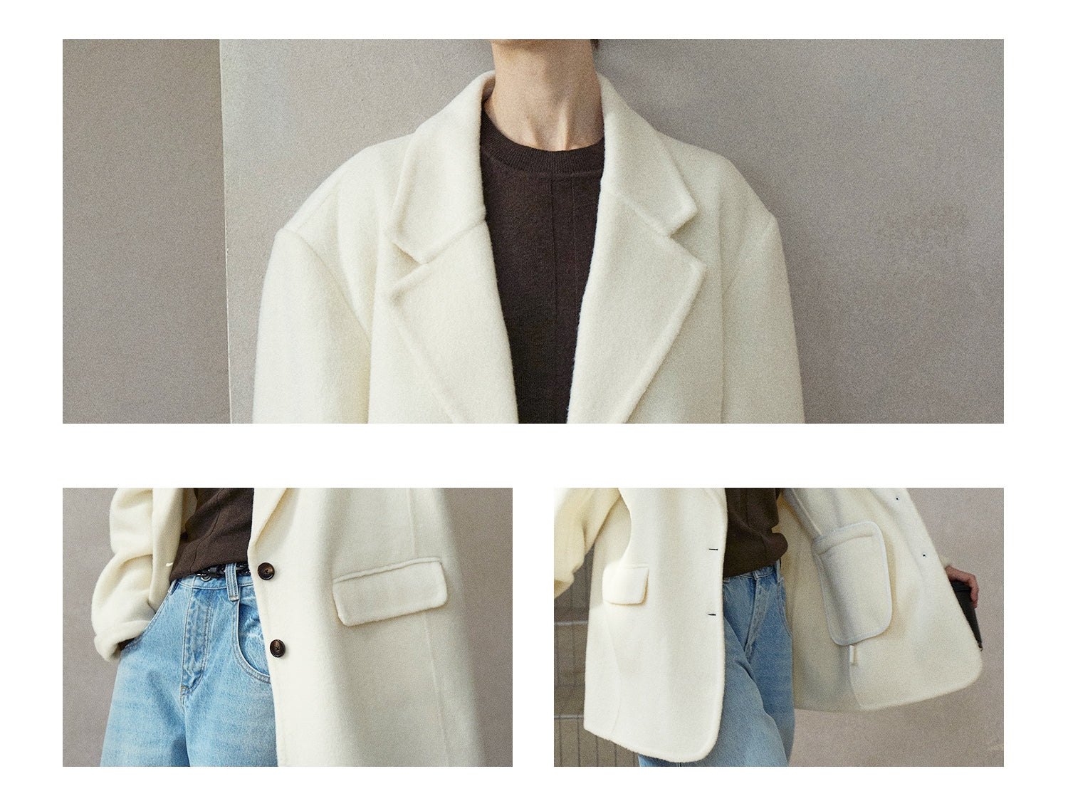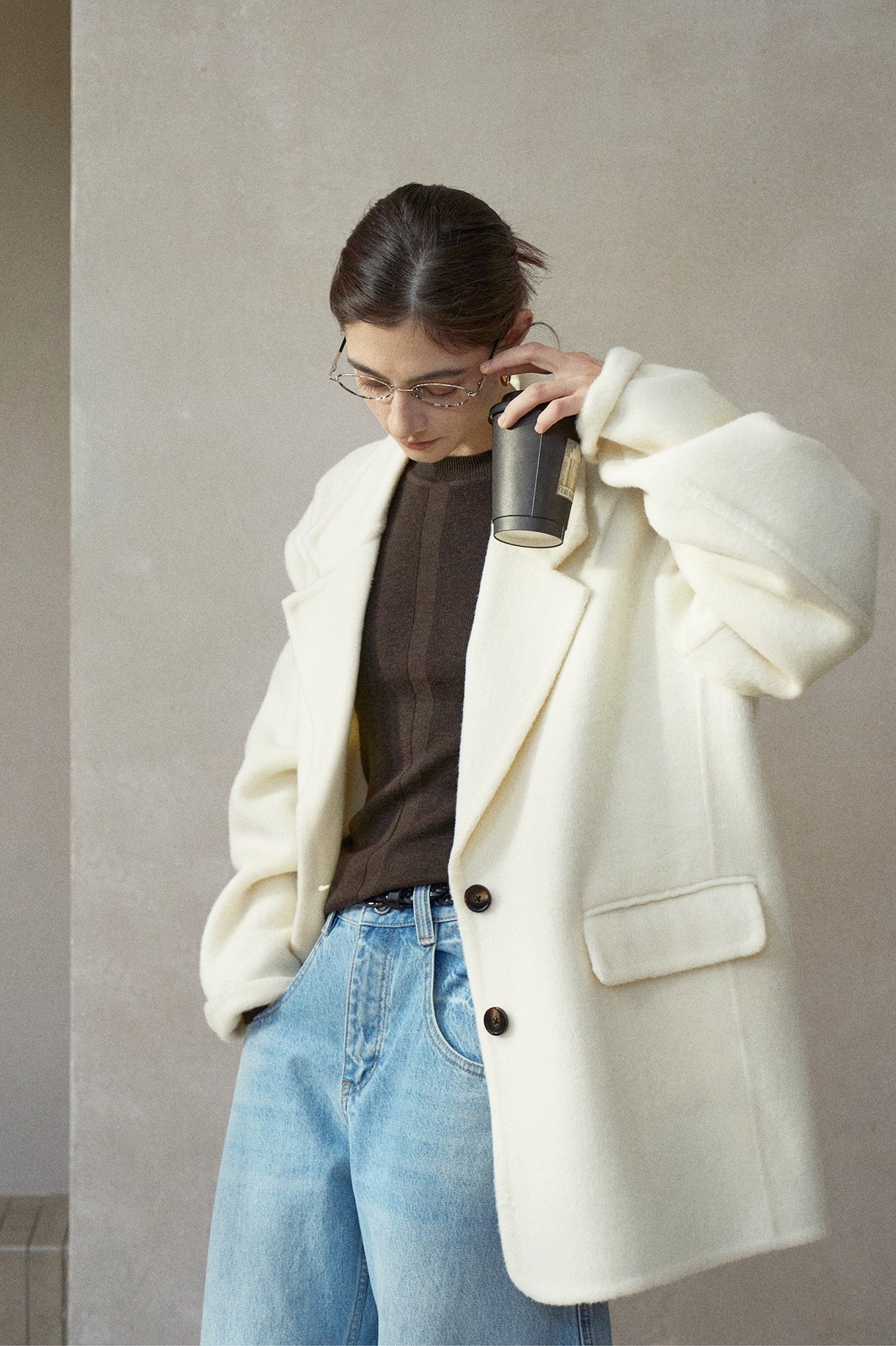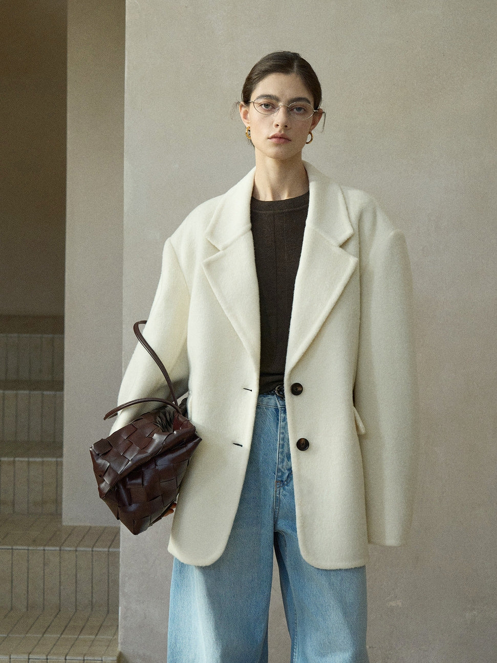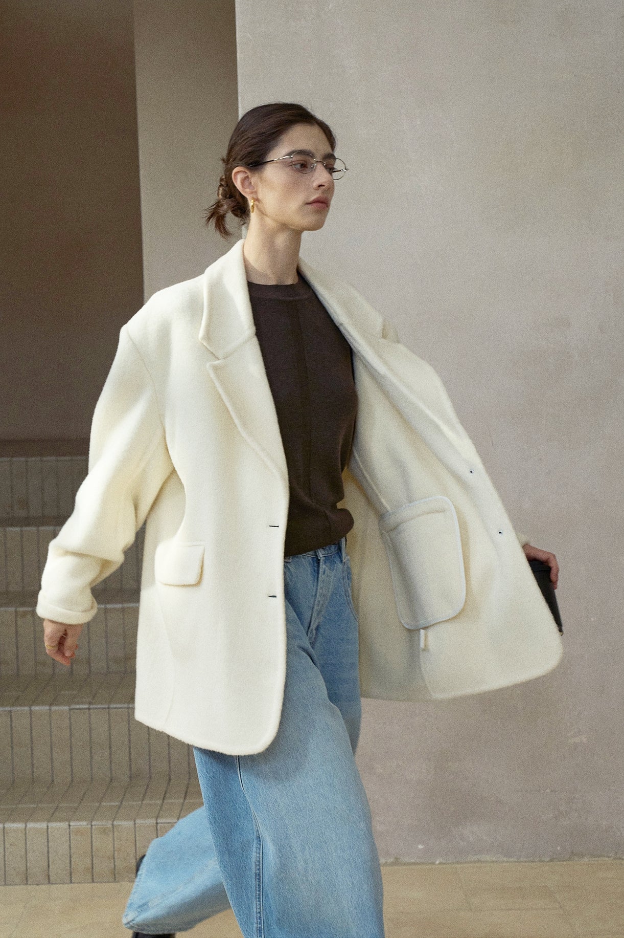深めのラペルと構築的なショルダーラインが端正な印象を引き立て、羽織るだけでスタイリングを格上げする存在感。