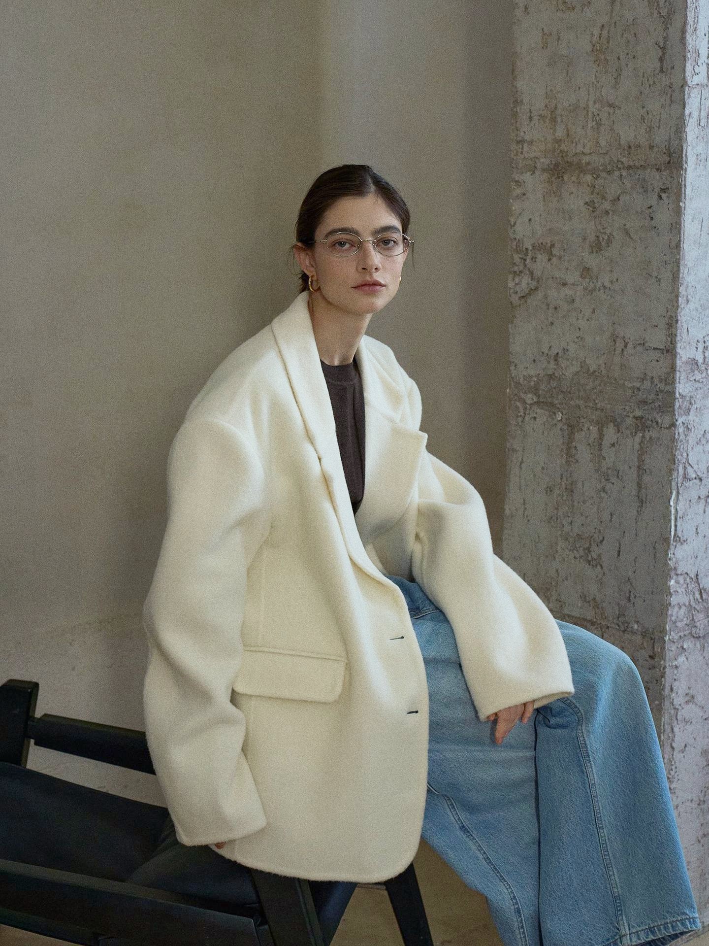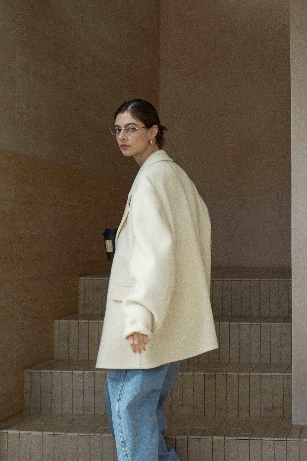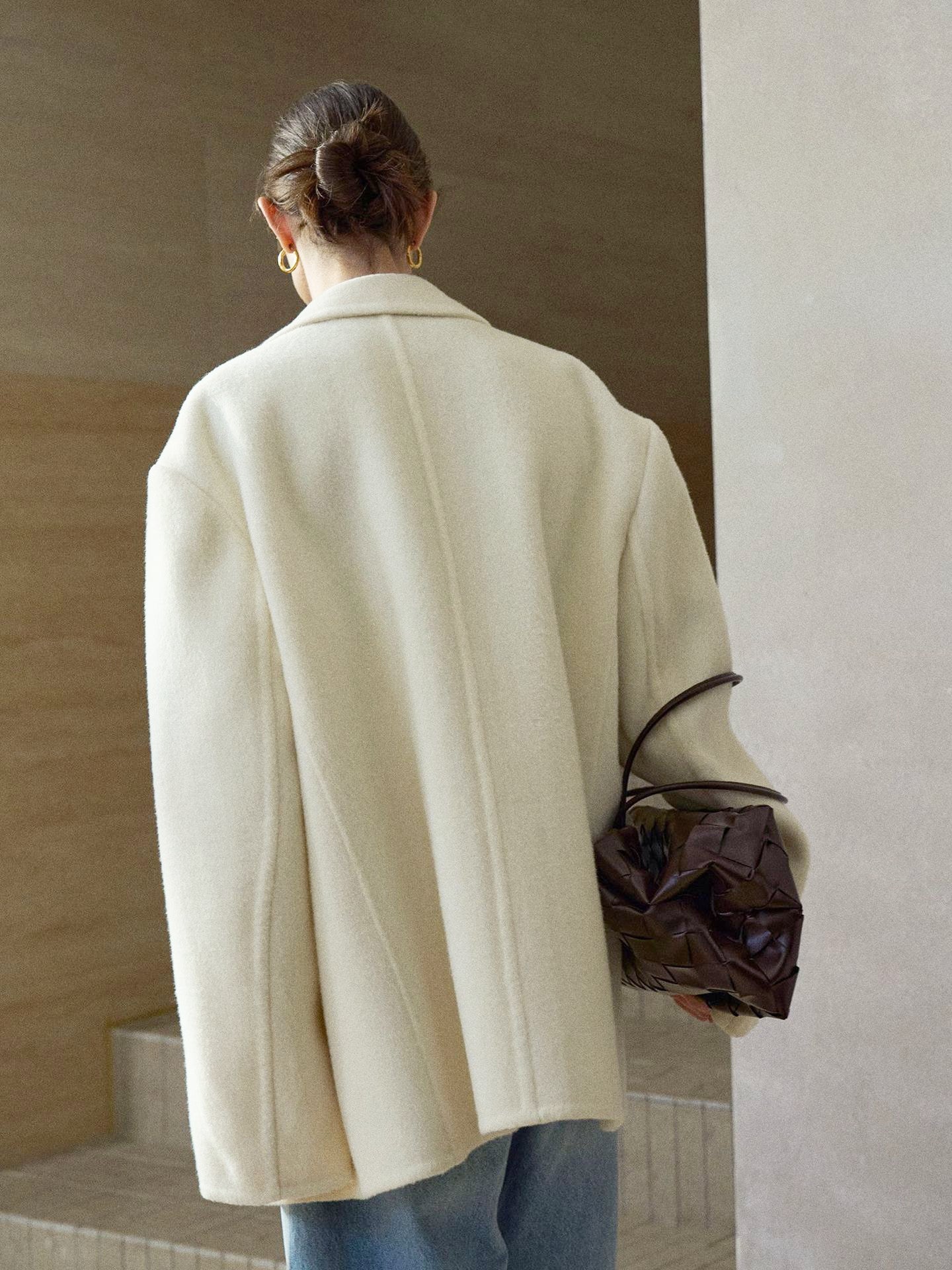 深めのラペルと構築的なショルダーラインが端正な印象を引き立て、羽織るだけでスタイリングを格上げする存在感。