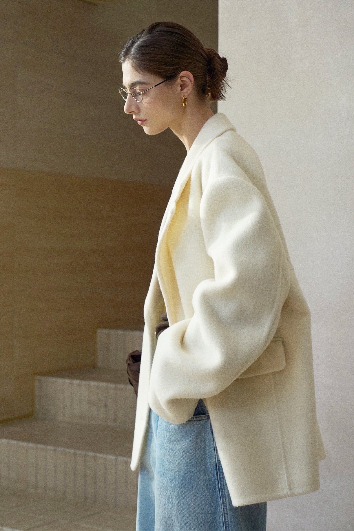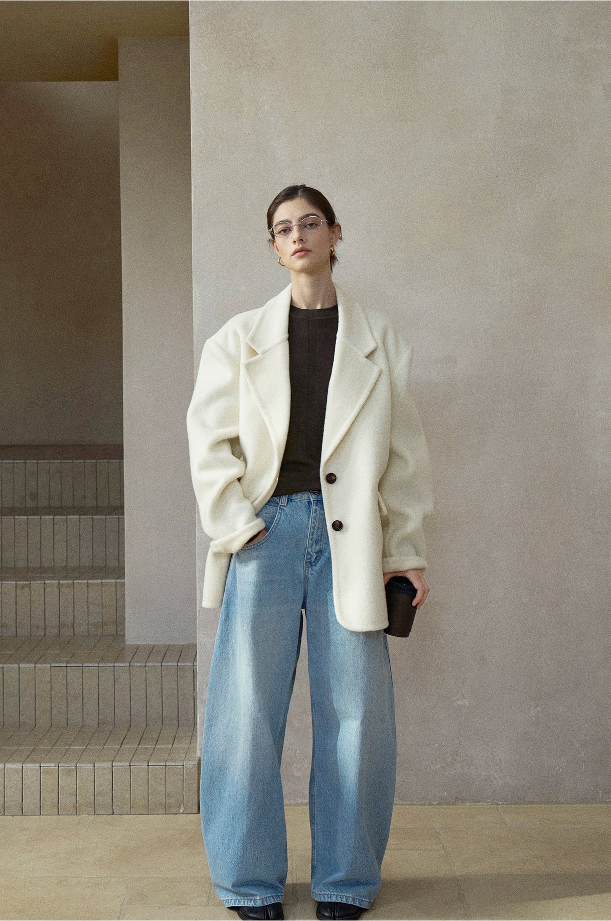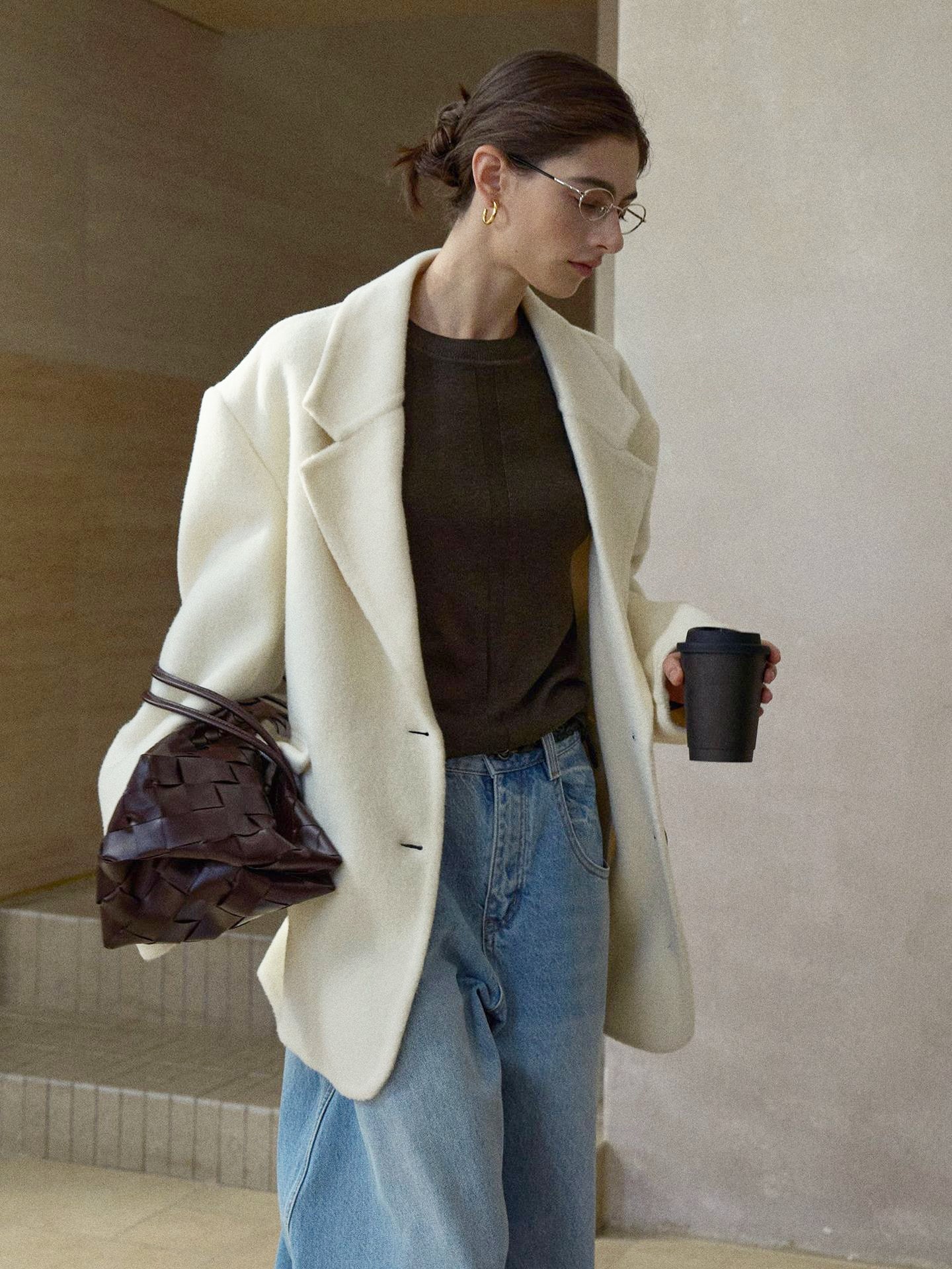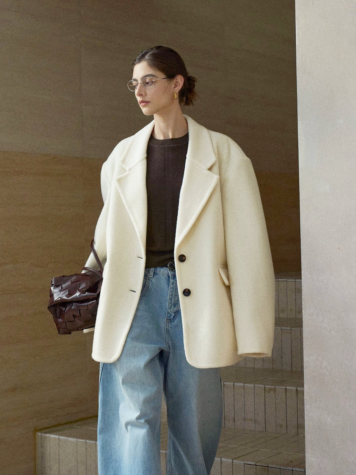 深めのラペルと構築的なショルダーラインが端正な印象を引き立て、羽織るだけでスタイリングを格上げする存在感。